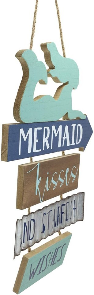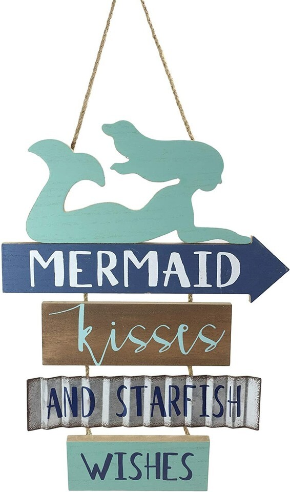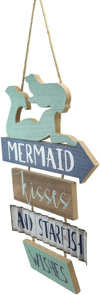 ? Featuring a teal colored mermaid silhouette surfing, the wall sign reads "Mermaid Kisses And Starfish Wishes". The words of the phrase are split up into 4 boards of different colors, with one of them being made of galvanized metal for a vintage rustic feel. The wall sign hangs on convenient jute strings.