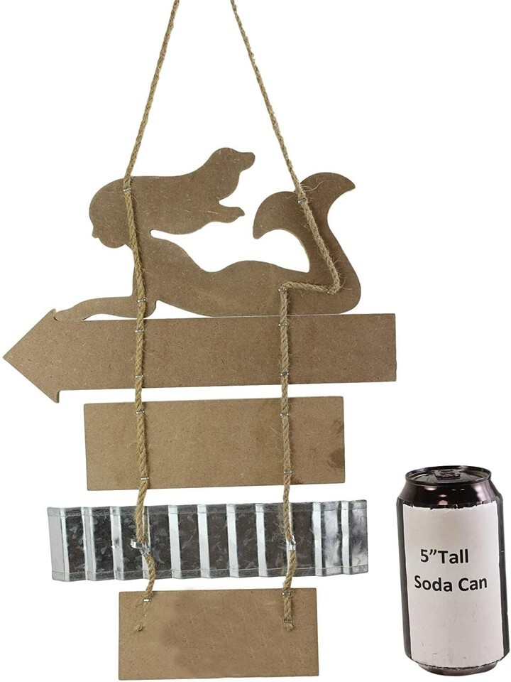 ? This Nautical Coastal Mermaid Wall Decor Sign is made of strong fiberboard, galvanized metal and jute strings. The decorative sign is hand painted and polished for a vintage rustic nautical finish.