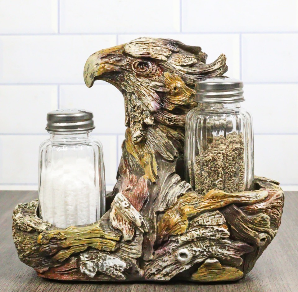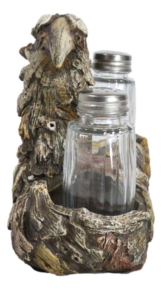 ? Elevate your dining decor with our Bald Eagle sculpture. This stunning piece features a majestic Bald Eagle perched upon Woodlands Tree Branches, all crafted with meticulous detail and finished in a Faux Wooden texture. The glass shakers within provide a stylish and practical touch to your table settings. Embrace the spirit of the great outdoors with this unique and eye-catching addition to your kitchen, celebrating the majestic beauty of the American Bald Eagle in every meal.
