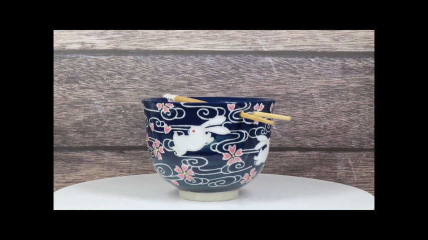 ? This Beautiful Asian Soup Bowl comes with a pair of wooden chopsticks. The bowl features a very convenient chopstick rest at the top of the bowl. The bowl is great not only for Ramen or Donburi but also for soup, cereal, rice or what have you!