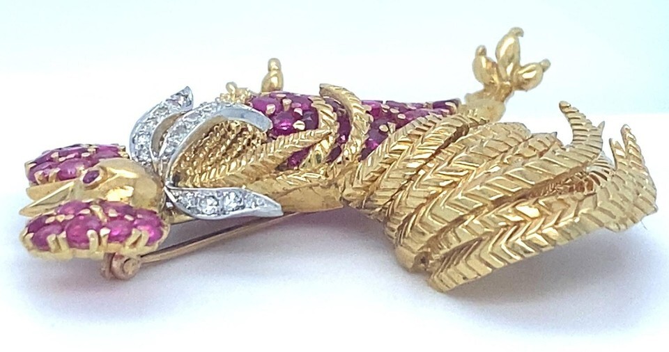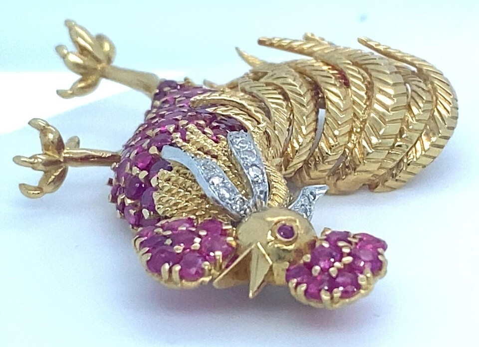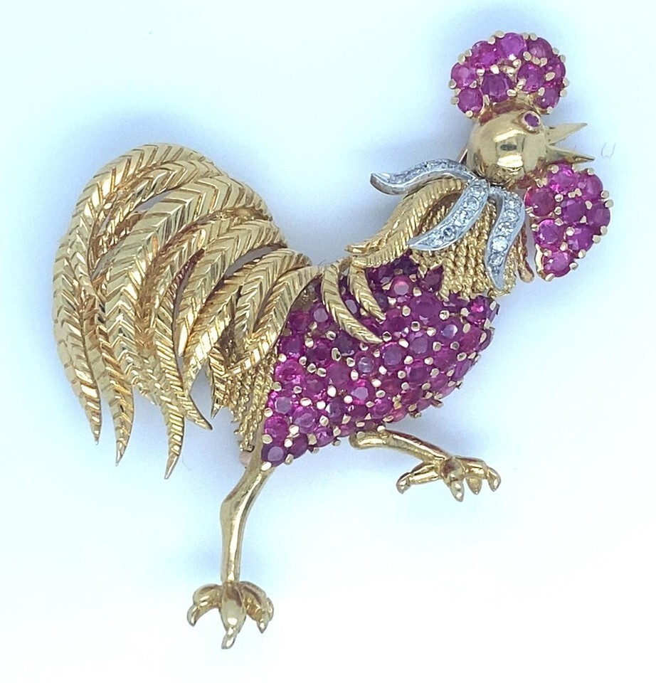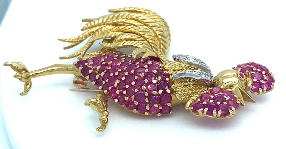 Tiffany Co. 18k Yellow Gold and Platinum Ruby and Diamond Rooster Brooch
