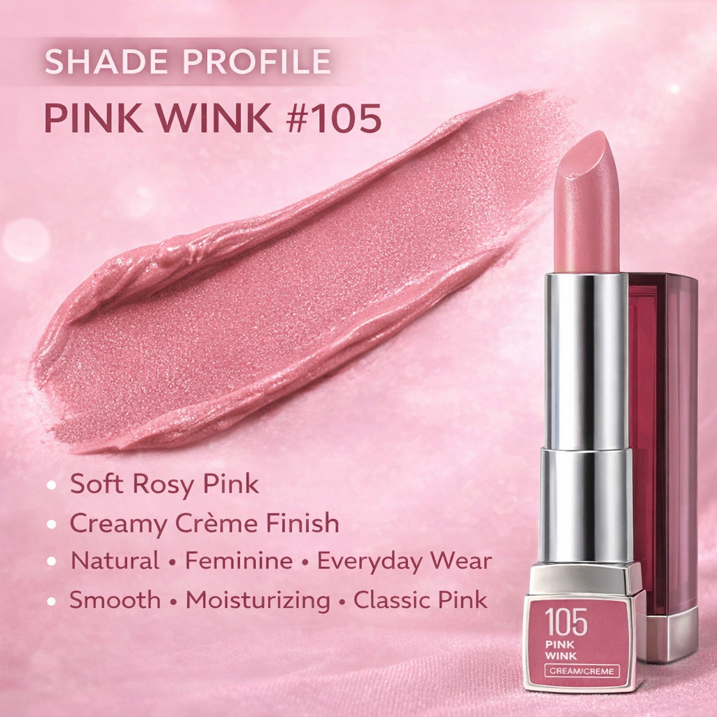 Enhance your lips with the classic beauty of Maybelline Color Sensational Lipstick in Pink Wink #105. This full-size lipstick delivers a creamy, smooth finish with rich color payoff and comfortable wear.
