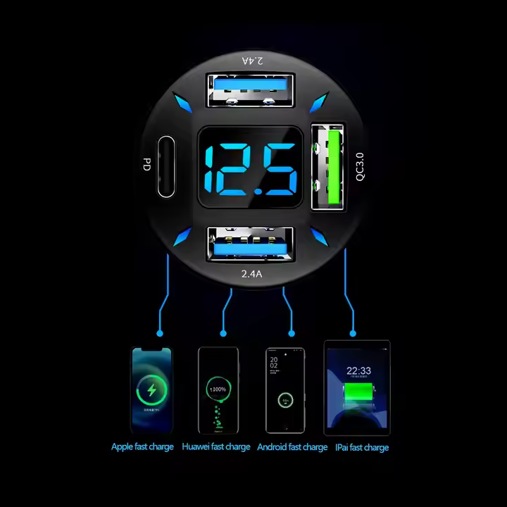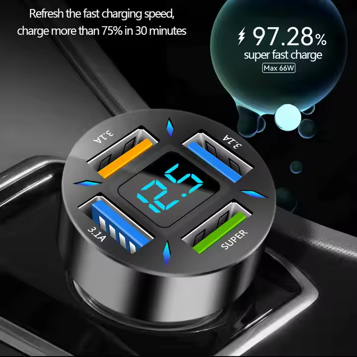 Keep your devices powered up on the go with the Daimokh 66W Car Charger with 4 USB Ports. This charger offers fast charging and the ability to connect multiple devices simultaneously.