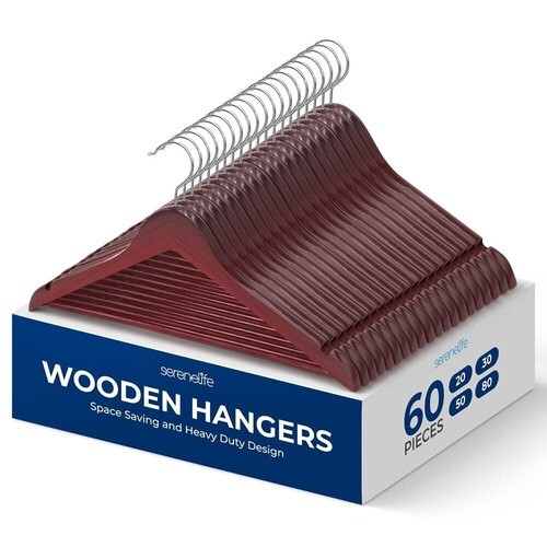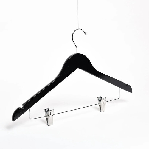 These strong, cleverly constructed clamp style hangers are made from the finest hardwood and feature internal soft felt pads that protect and support heavy garments. These space-saving hangers are made with a double coating of lacquer to prevent splintering and a polished steel swivel hook.