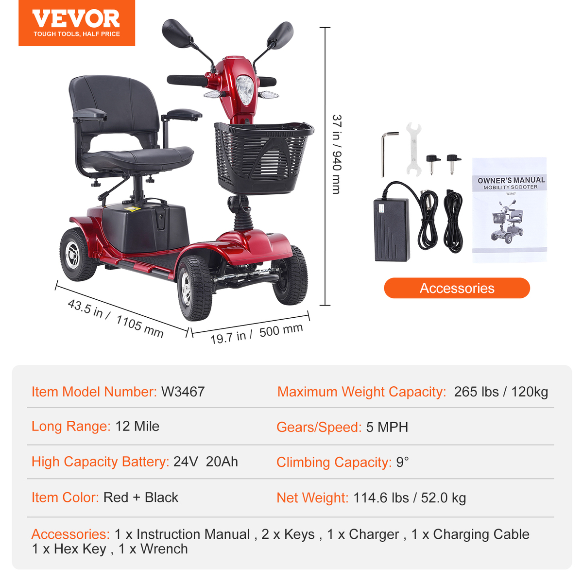 Strong Weight Capacity: Crafted with high-quality materials and meticulous craftsmanship, VEVOR heavy-duty 4 wheel mobility scooter can support up to 265 pounds, offering reliable support and outstanding stability. It is suitable for the elderly, adults, and people with disabilities, enhancing their mobility and quality of life.