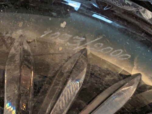 A vendre est un bol couvert de piece maîtresse Millennium de Waterford Father Time Ireland 1033/2000. Le bol est grave a l'acide sur le cote "Pere Temps... Pose legerement sa main sur ceux qui l'ont bien utilise." Mesure environ 9 1/2" de diametre mesure au bord superieur, 7 1/2" de hauteur avec couvercle et pres de 9 livres de poids.