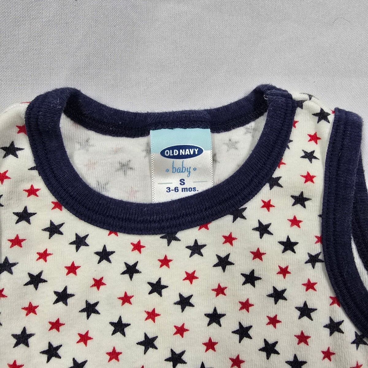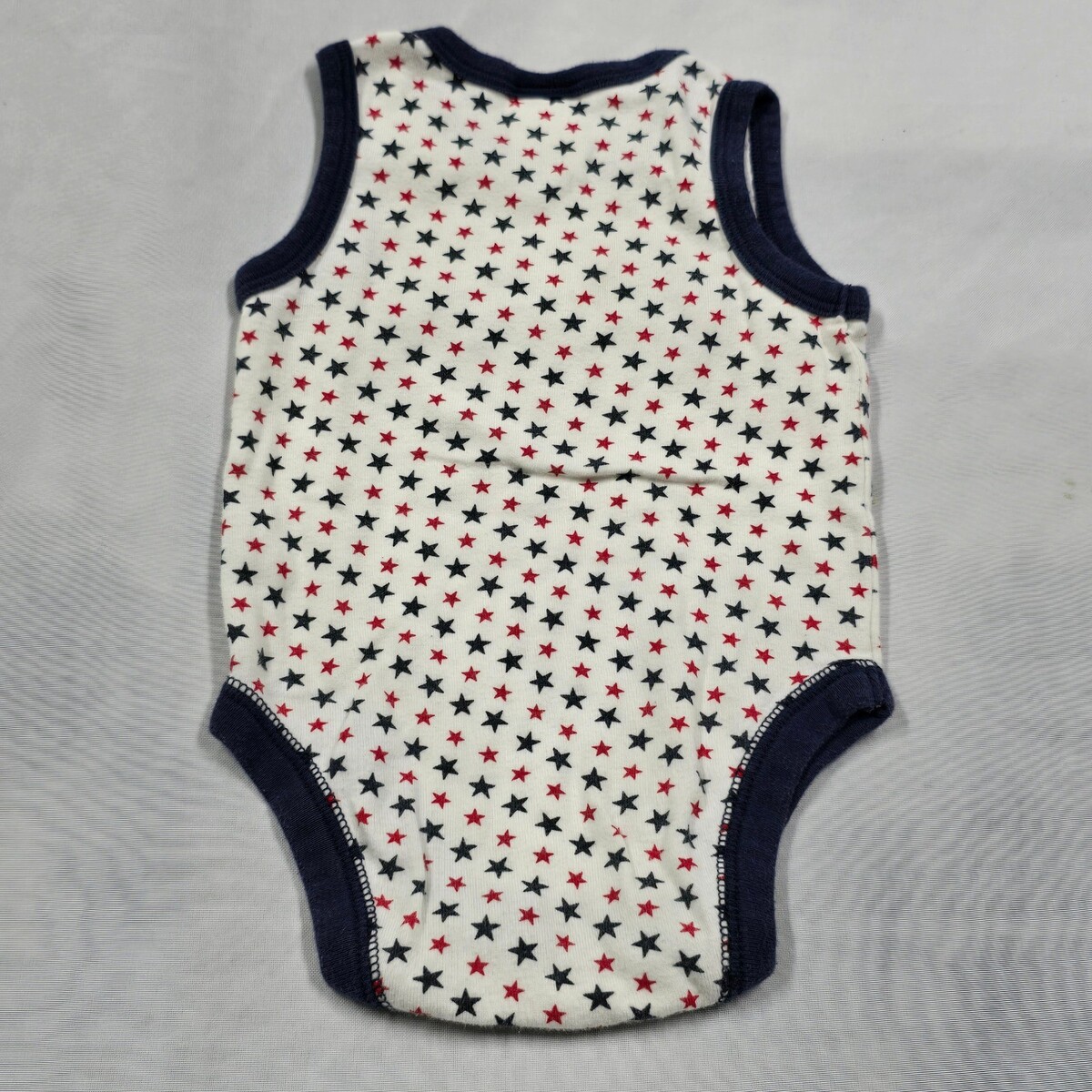 Keywords: onesie, romper, stars print, patriotic, summer, infant, sleeveless, snap crotch, baby boy, baby girl, gender neutral, American theme, comfortable, everyday wear, vintage, retro, 2000s, nostalgic, nostalgia