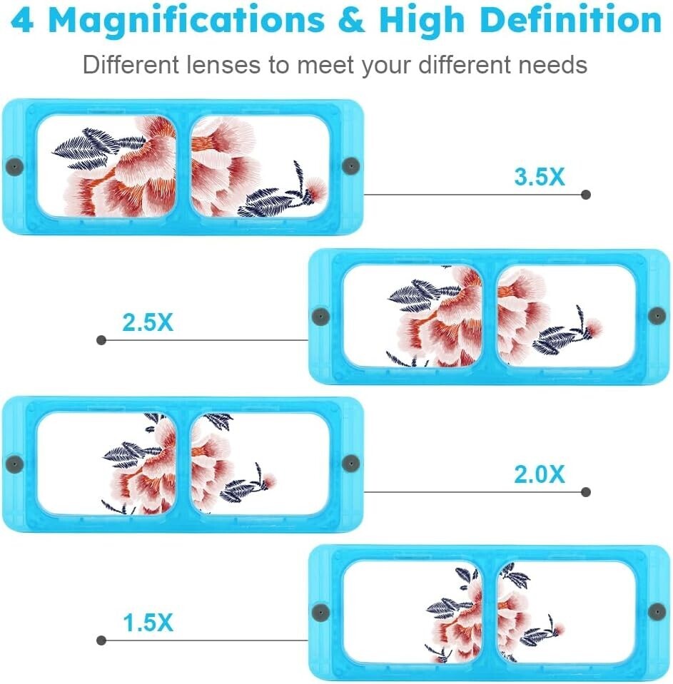 LENSES: Magnifying glass come with 4 replaceable lens at 1.5X, 2.0X, 2.5X, 3.5X maginification,Each lenses are different totally. 1.5X power at 333mm focal length, 2.0X power at 250mm focal length, 2.5X power at 200mm focal length, 3.5X power at 142mm focal length. Magnifying glass can provide a specific magnification power (X), the viewing ability is depended on the distance from the object you adjust.