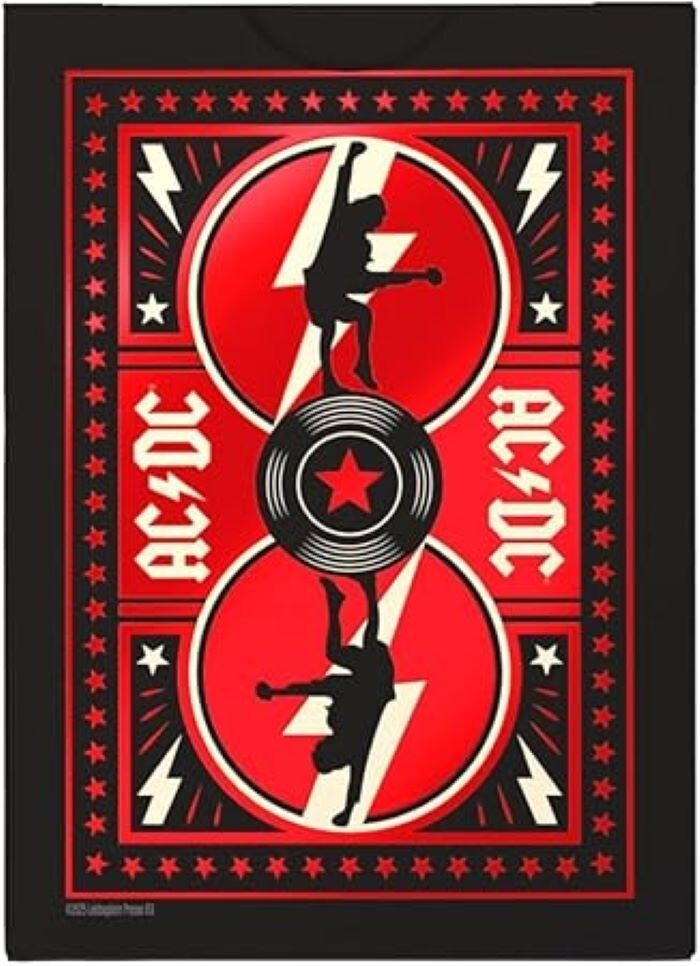 ROCKING CHARACTER ART? Deal out court cards featuring Angus Young and his iconic guitar. Lightning bolt motifs and callouts to iconic song titles can be found throughout the deck, with custom designed card backs and a flashing red foil tuck case.