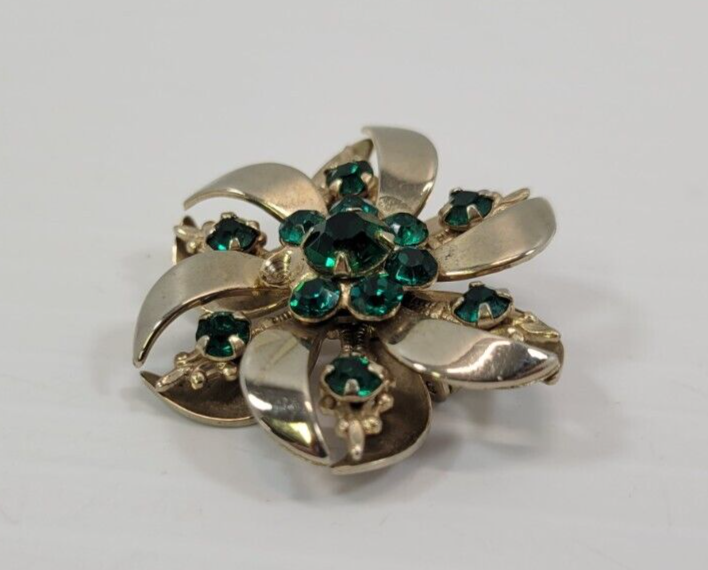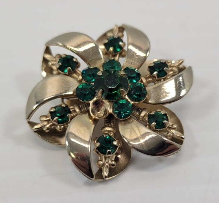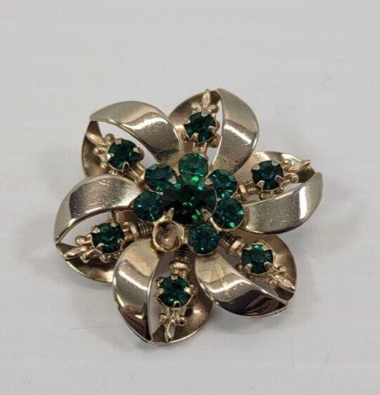 *B9) Vintage Gold Tone Faux Green Emerald Rhinestone Brooch Pin