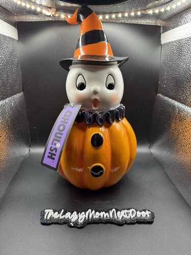 Set a spooky Halloween scene with the bubbling potion this witch is brewing! Foggy steam spews when paired with water from the cauldron as this witch is joined by a fanged bat, black cat and skulls.