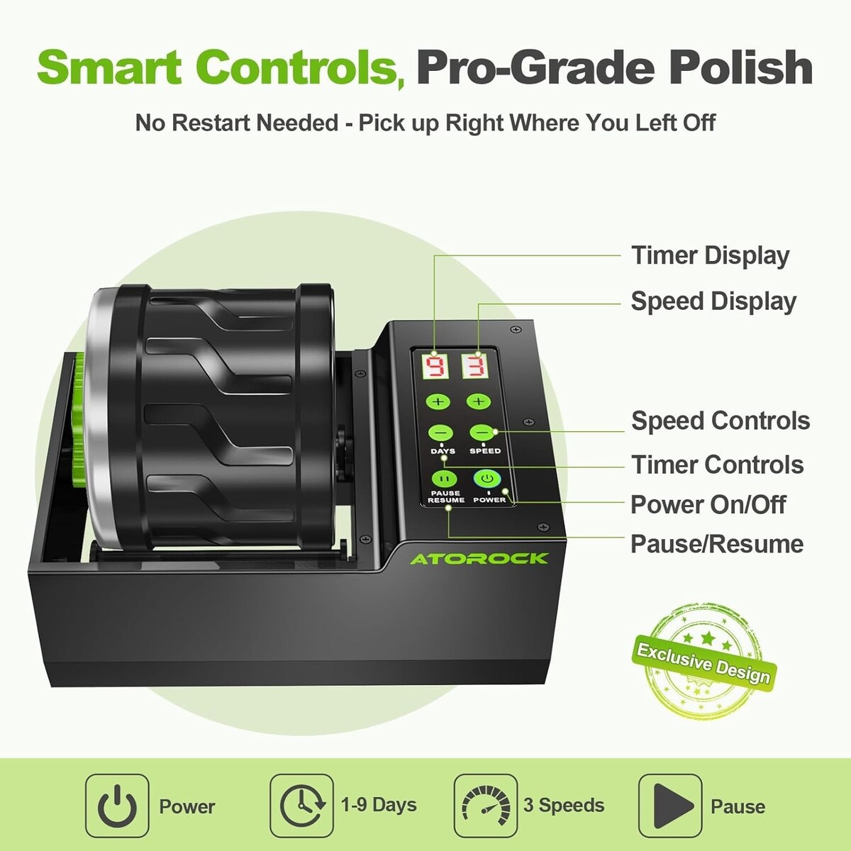 Dial in your perfect polish with four speed settings and a programmable 9-day timer featuring auto shut-off and memory recall. Ideal for users who want tighter control over grit stages and cycle timing.