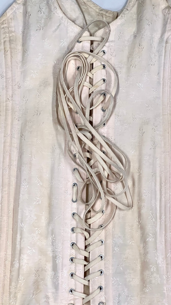 RARE Vtg L/XL 40 CORSELETTE 4 Garters Open Bottom Corset Girdle Brocade Penneys Adonna pink- in stained and well worn-well loved condition. As found. Hooks in front, lace up back. Label states sz 40, Peach floral brocade. Wire-free cups. 4 attached metal garters. Hook and eye closure as well as inside. NON-adjustable straps. The lacing on the back allows for a larger size.