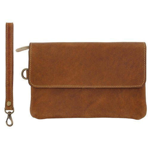 Made from pebble grain up Silver hardware Detachable wrist strap, top zip closure, outer phone pocket with snap closure, 1 credit card wall, bill slot and coin pouch