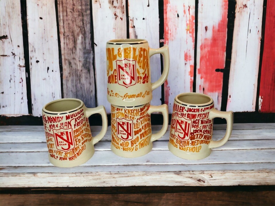 This is an amazing piece of history! Set of 4 large white ceramic beer steins/mugs signed by members of the 1958 New Jersey Ski Club in colors of red, orange and yellow. Wonderful collection for any sports bar, pub shed, sports or ski themed man cave!