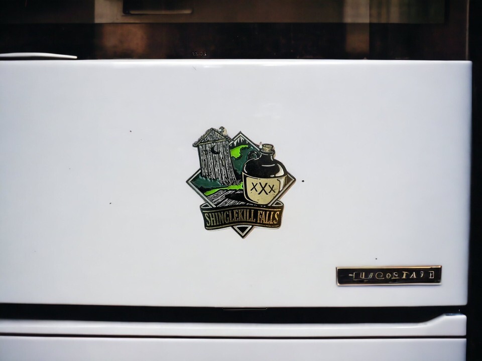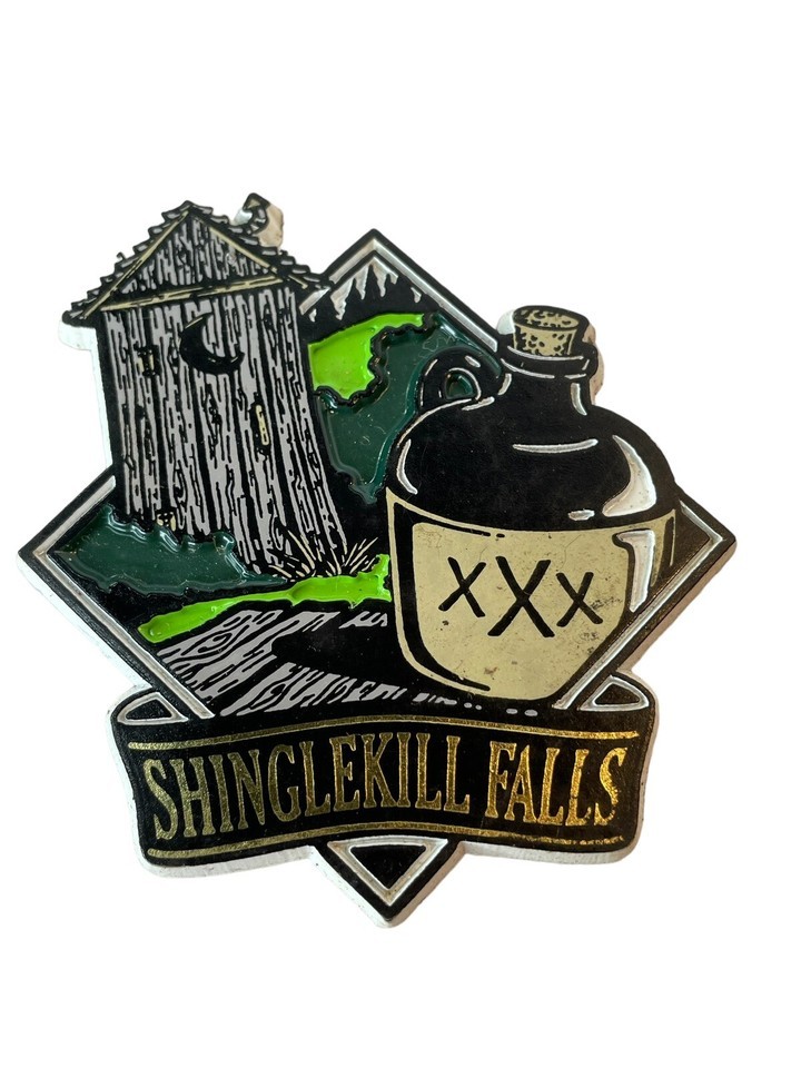 Awesome vintage souvenir tourist magnet from Shinglekill Falls in Purling, NY. Depicts a liquor/moonshine jug ans and outhouse. Says ?Shinglekill Falls.?