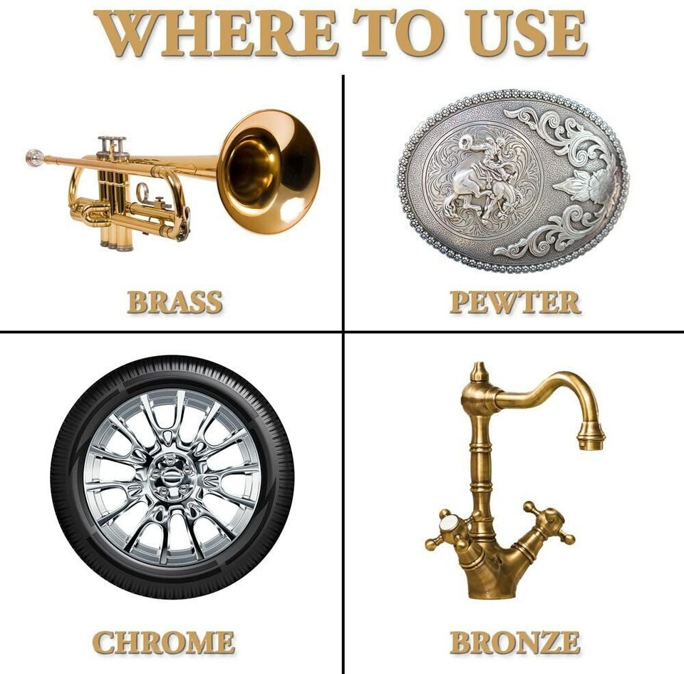 BRASS, COPPER, STAINLESS, CHROME, ALUMINUM, PEWTER |