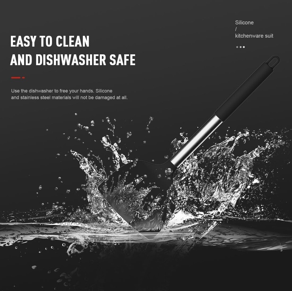 ? ?Comfortable Grip Dishwasher Safe? ? Each utensil features a 304 stainless steel handle wrapped in soft silicone, offering a secure, anti-slip grip that stays cool during cooking. The seamless one-piece design prevents food buildup and makes cleaning effortless ? just pop them in the dishwasher for quick and easy maintenance.