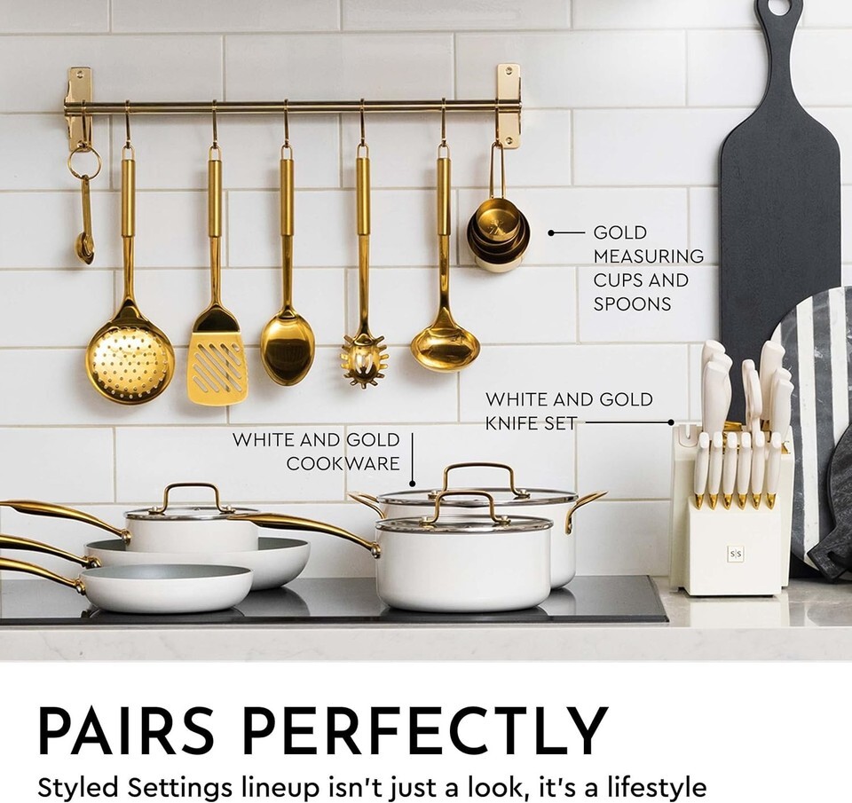 Your kitchen style is a reflection of you?even down to the utensils on your countertop. This beautifully crafted Gold Kitchen Utensil Set is designed to be displayed, not hidden away. Hang them for easy access or showcase them in a utensil holder to save drawer space while adding a luxe accent to your kitchen decor.