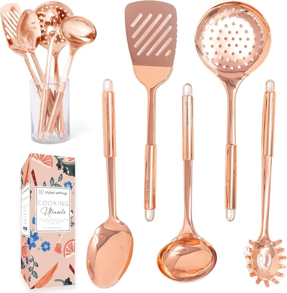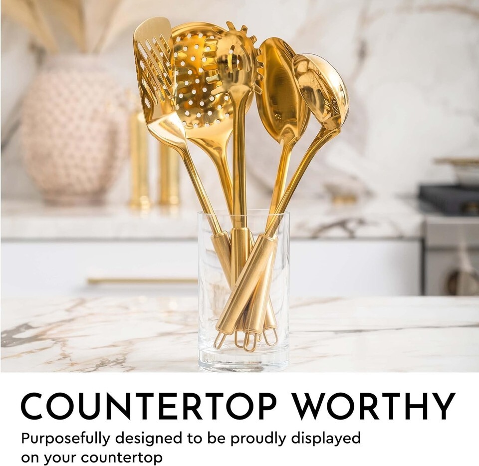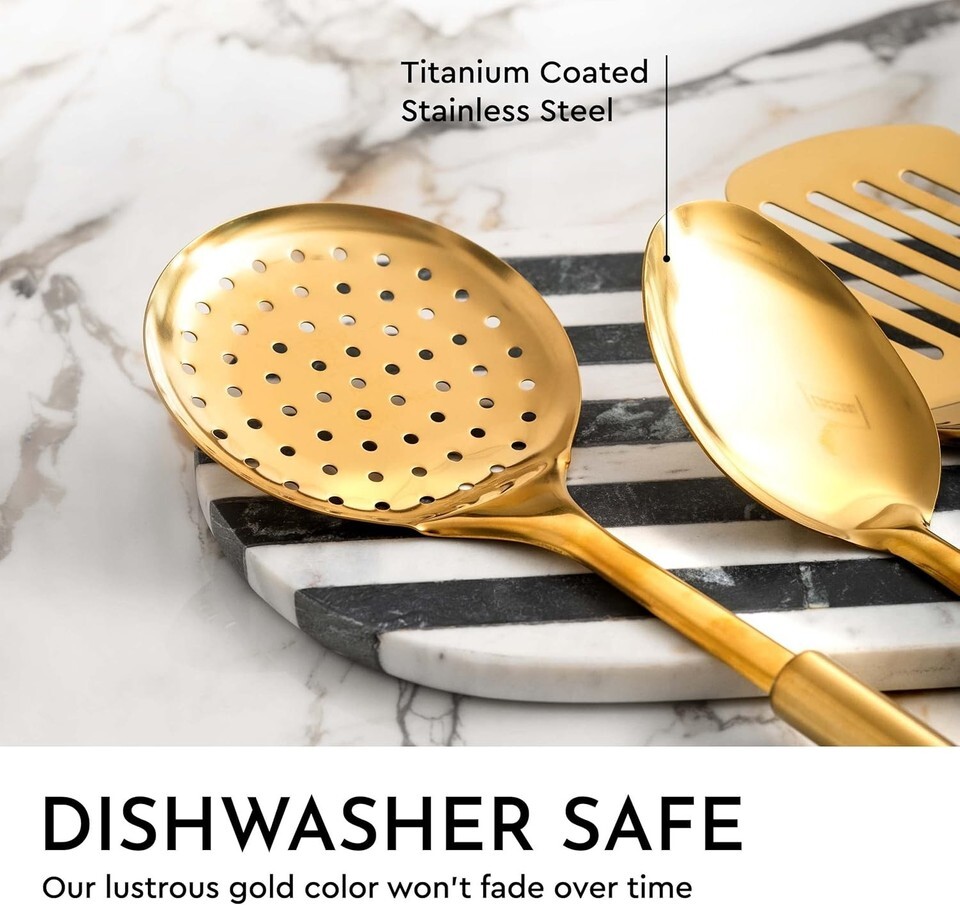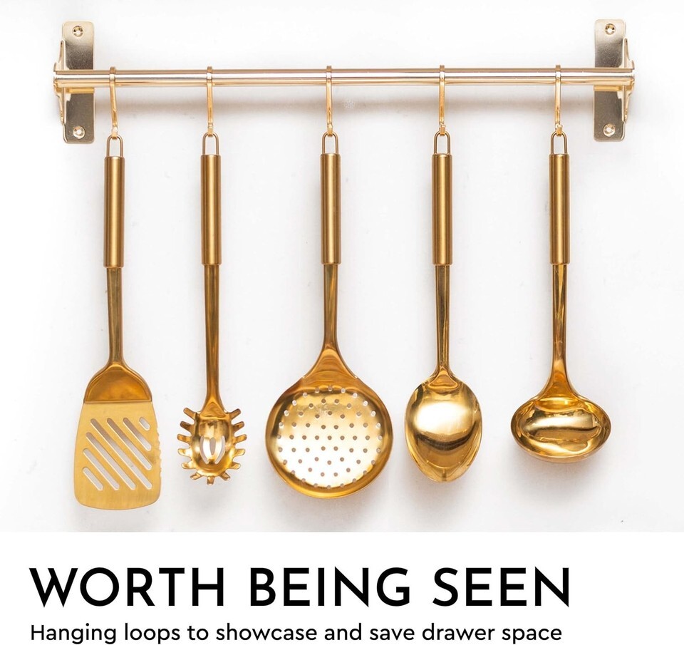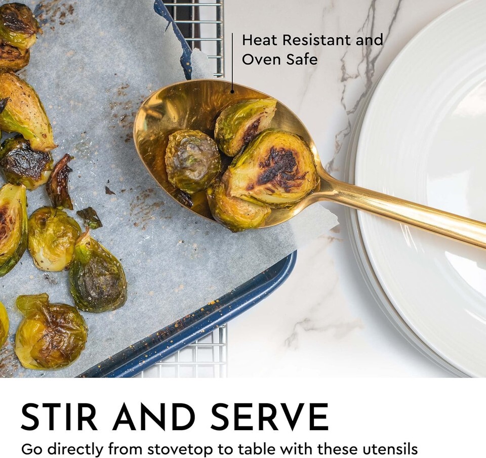 Elegant enough for serving and durable enough for everyday cooking, these brass-toned gold utensils bring a subtle sparkle to your kitchen. Whether you?re preparing meals, serving guests, or simply styling your countertop, these utensils are made to be used and admired.