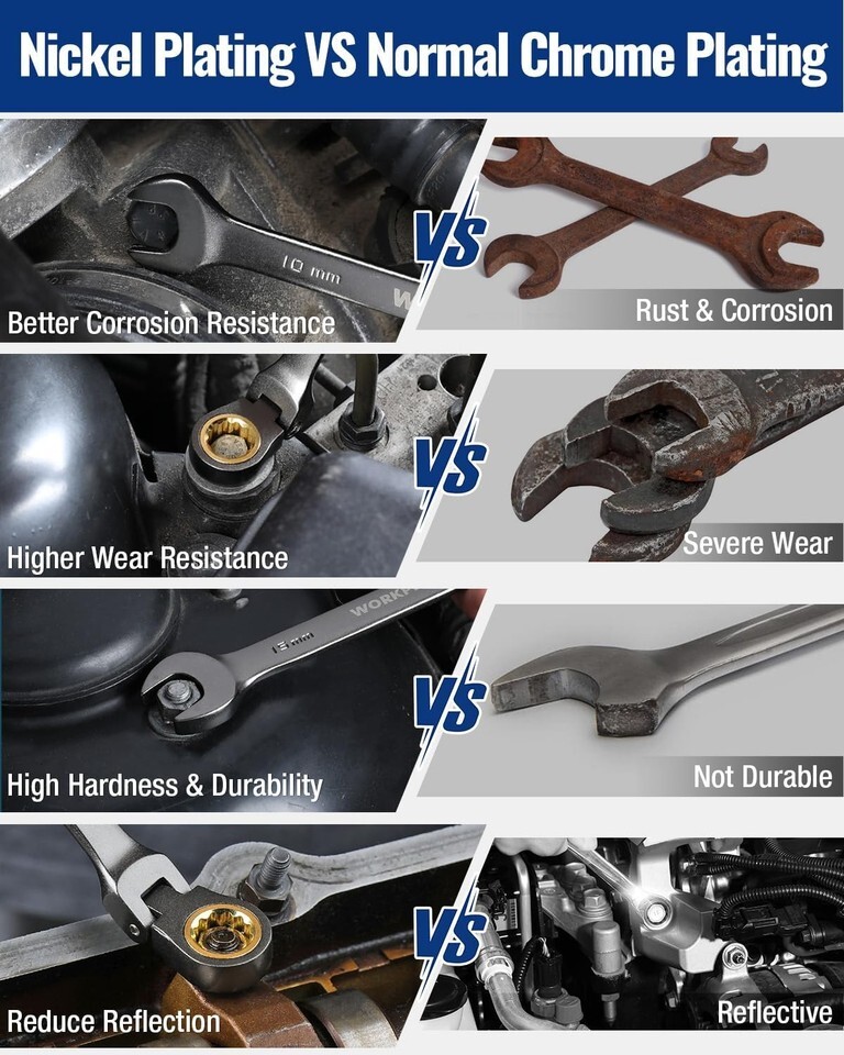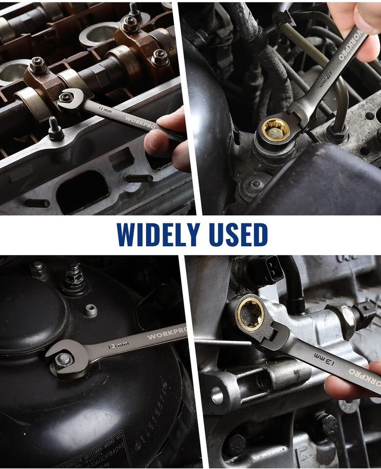Achieve precision and ease in tight spaces with the WORKPRO Flex-Head Ratcheting Combination Wrench Set. Designed for professional mechanics, DIY enthusiasts, and home repair projects, this set combines strength, flexibility, and efficiency in a compact, portable kit.