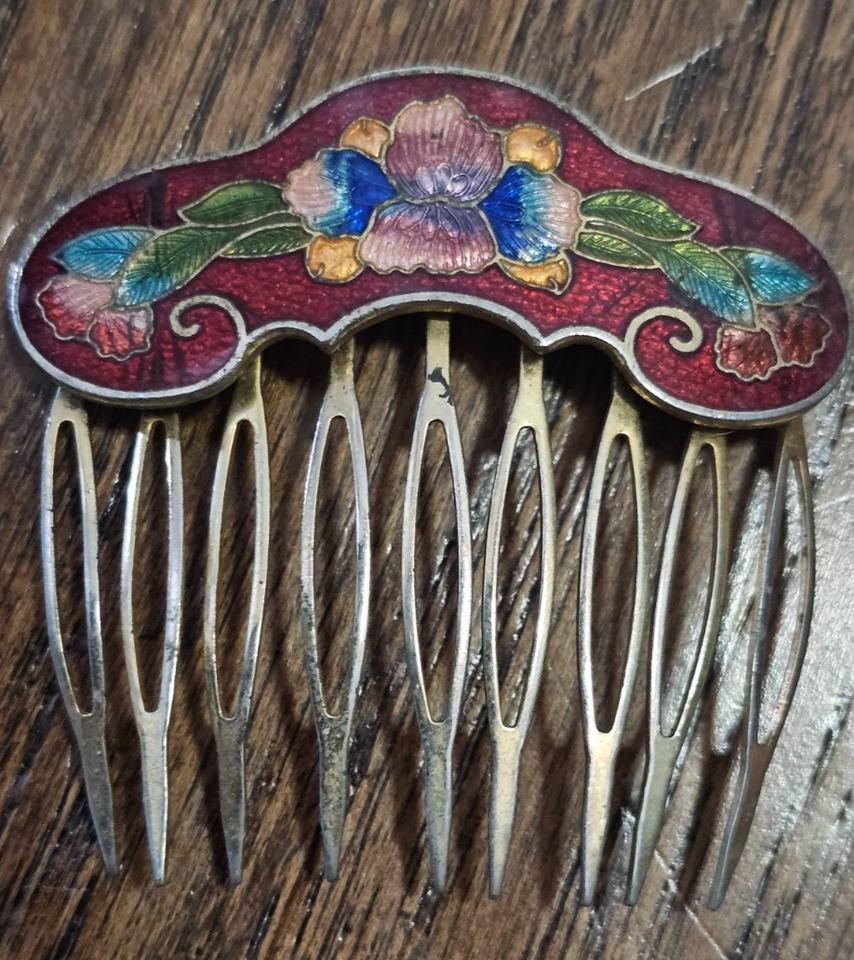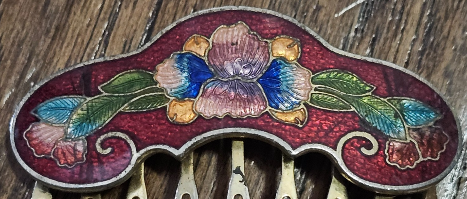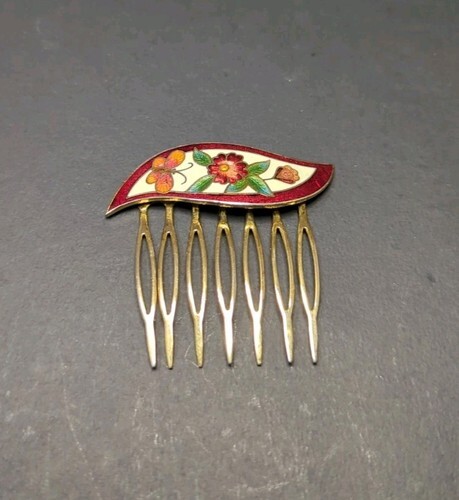 Vintage Cloisonne Type Hair Comb Gold tone Burgandy Enamel Floral WHTDRW
