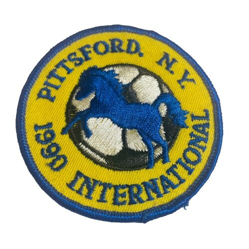 This yellow blue horse embroidered patch is a unique addition to any soccer fan's collection. The patch features an original design from the 1990 International Soccer tournament held in Pittsford, NY.