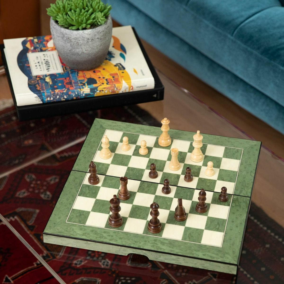 Backgammon, Chess and Checkers. This green inlaid lacquer finished set