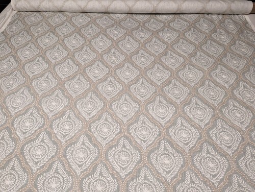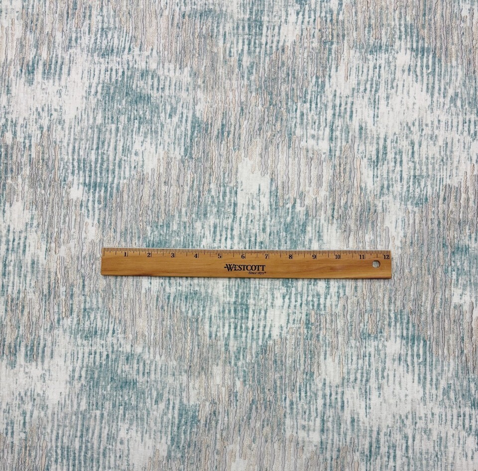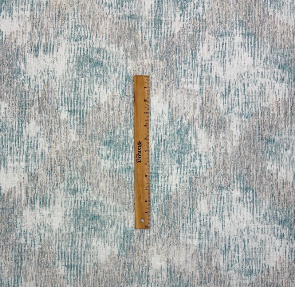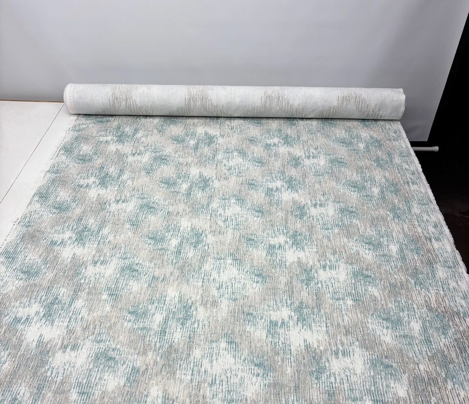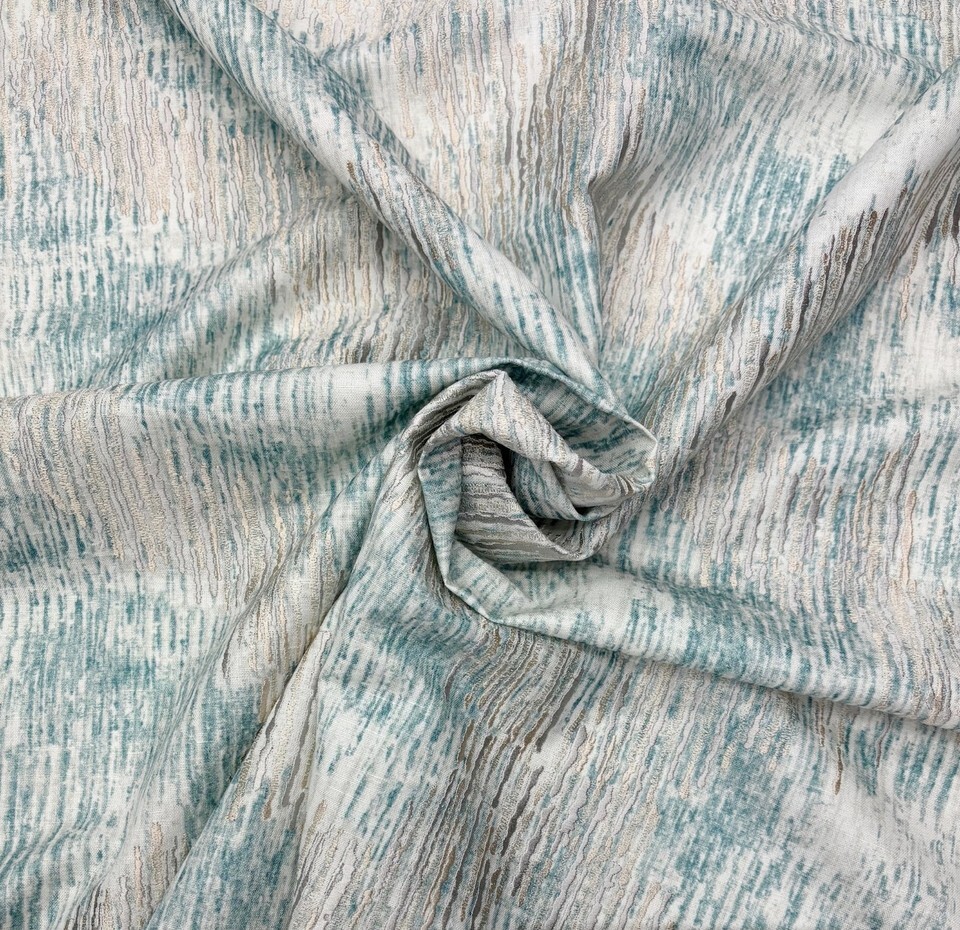 This lovely fabric combines abstract form with organic texture for a sophisticated designer look. The Fabric is printed on soft cotton-linen-viscose blend in shades of blue and beige that blend into one another much like a tie-dye. The subtle striations of color are accented with silver and gray viscose embroidery that catches the light for understated shimmer.