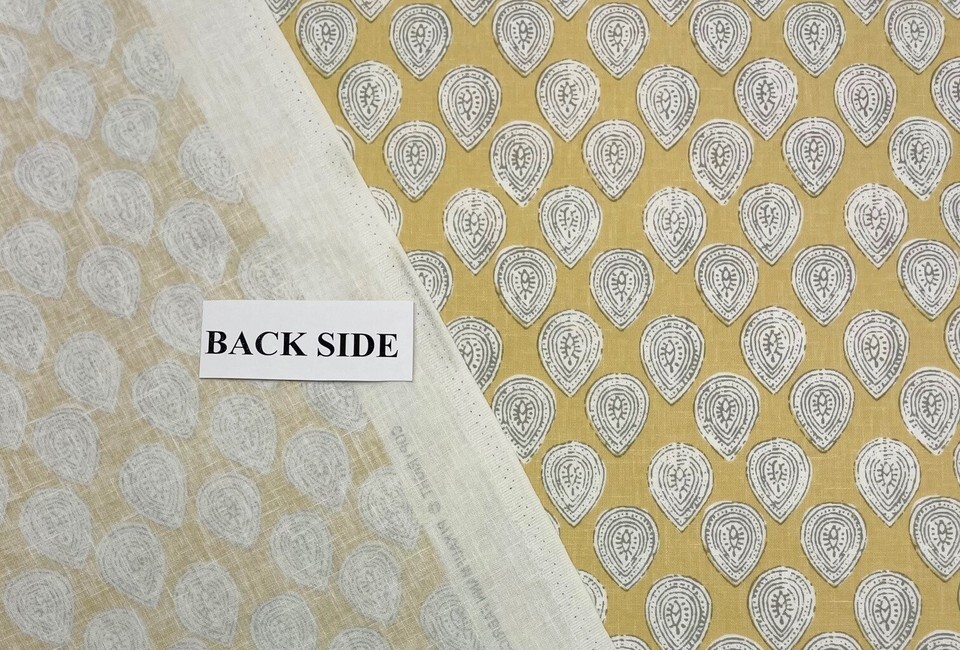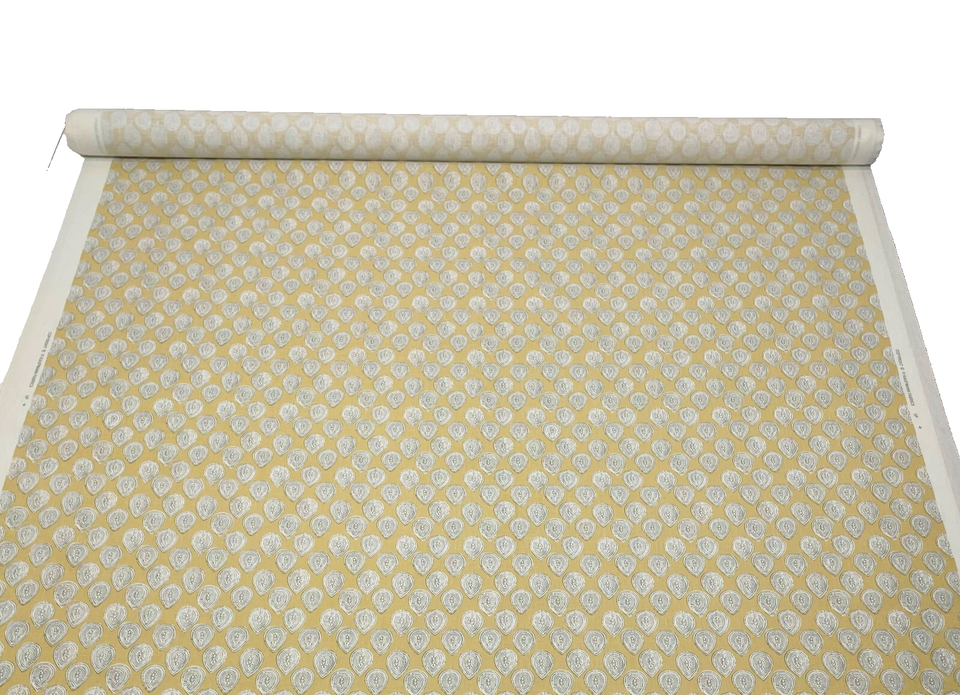 THIS GEOMETRIC PAISLEY WAS INSPIRED BY TRADITIONAL INDIAN BLOCK PRINT. IT IS MADE OF A CRISP POLY COTTON BLEND PRINTED IN IVORY TONES ON SOFT YELLOW BACKGROUND.