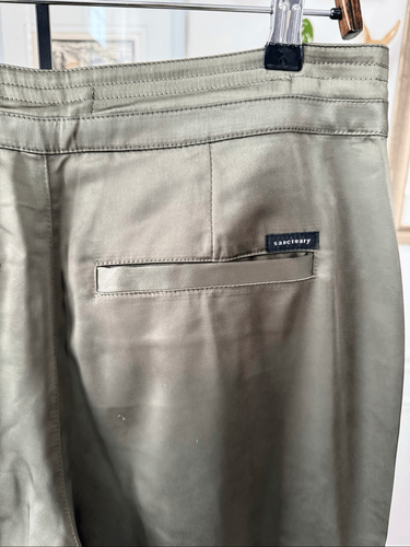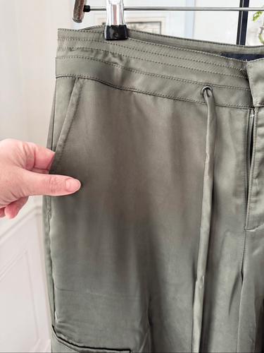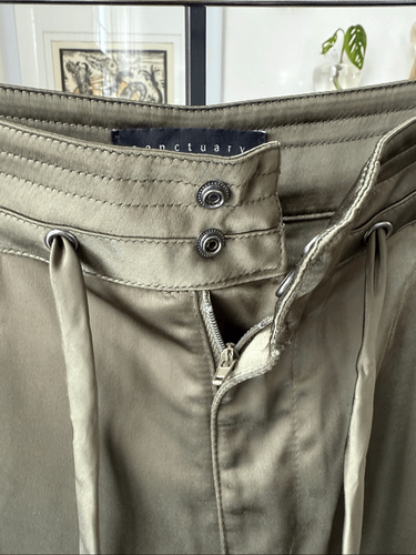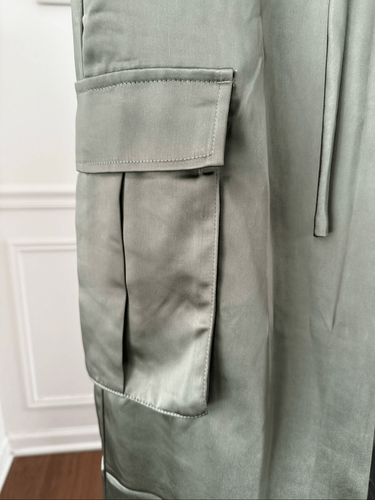 From Anthropologie, sanctuary Moss green satin cargo pants with drawstring ankles, that can be worn either as wide straight leg or tied jogger or balloon style. Contemporary yet timeless, Sanctuary embodies carefree California style and edgy East Coast fashion equally. This bi-coastal aesthetic produces a line of versatile cool-girl silhouettes that go from day to night with ease.
