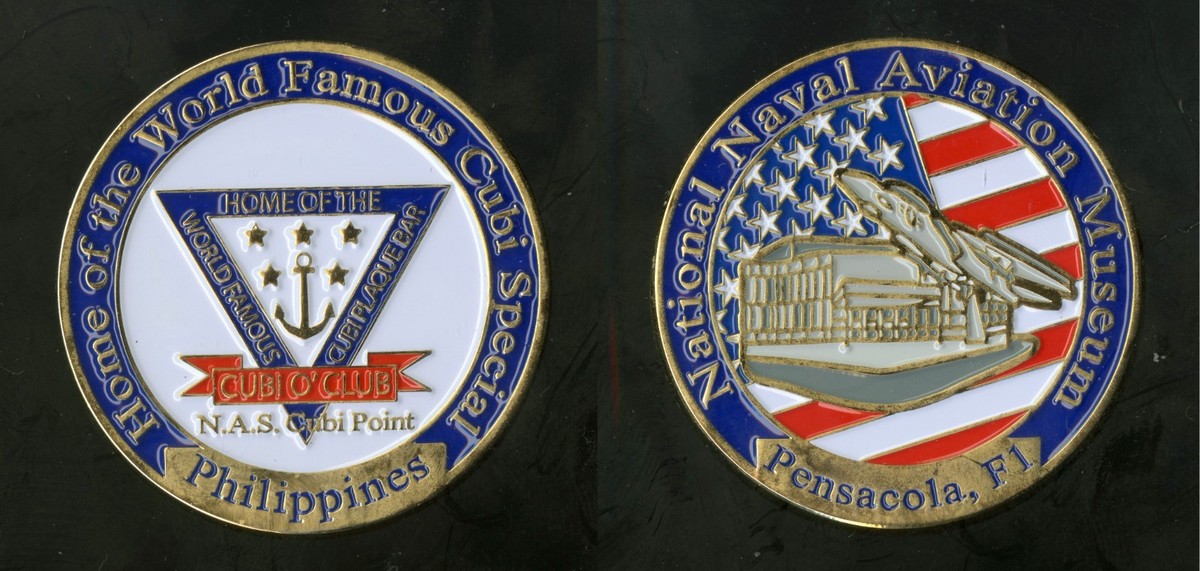 This is a Challenge Coin of the NATIONAL NAVAL MUSEUM NAS PENSACOLA WORLD FAMOUS CUBI SPECIAL AND A TRIBUTE TO THE OFFICER'S CLUB AT NAS CUBI POINT IN THE PHILIPPINES.