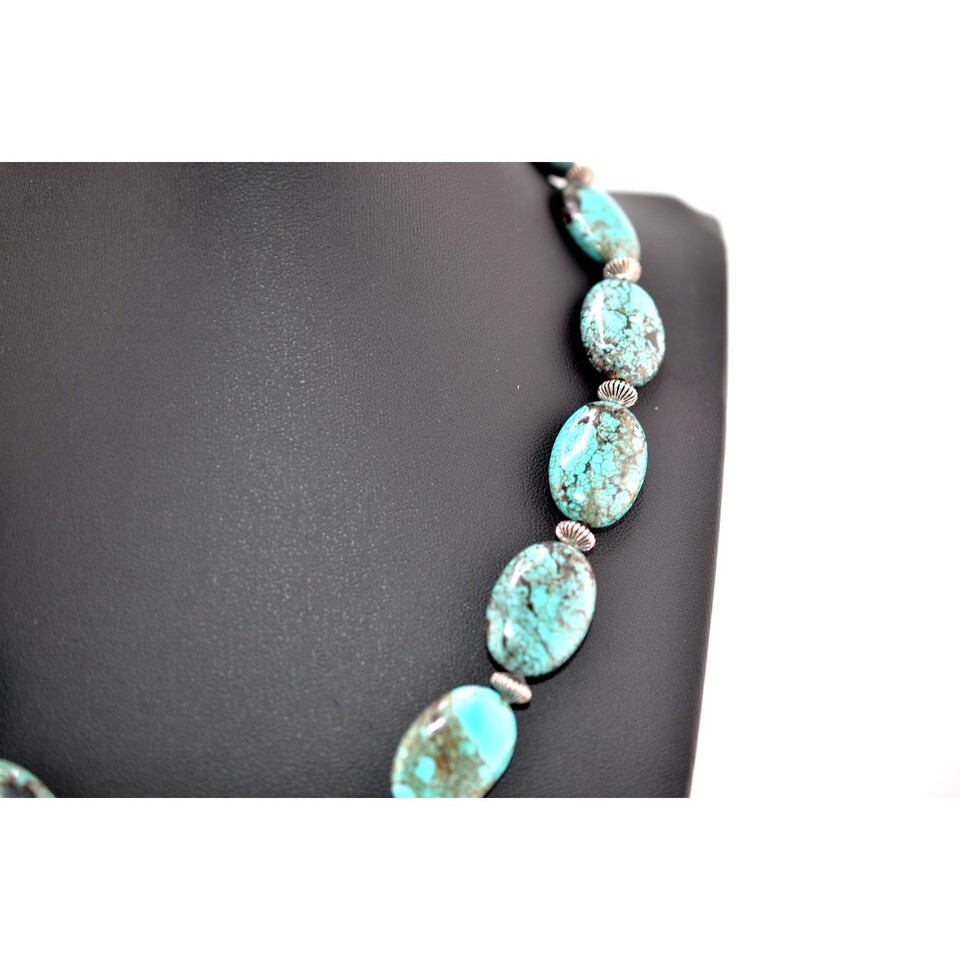 A GIFT BOX AND BAG WILL BE INCLUDED WITH EVERY ITEM PURCHASED DURING THE HOLIDAY SEASON.Genuine Tibetan, pebble shaped 5/8" x 1", Tibetan Turquoise 18 inch necklace and Navajo handmade. There are metal spacers and a sturdy hammered stainless clasp. Gorgeous. A percentage of your purchase is donated to SWIWC.org, assisting Native Women victims of domestic violence.