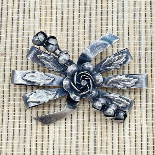 A GIFT BOX AND BAG WILL BE INCLUDED WITH EVERY ITEM PURCHASED DURING THE HOLIDAY SEASON.Vintage Hobe brooch produced in the 1940s. These unique designs feature elaborate, hand-crafted leaves and flowers, bows, baskets and hearts. The jewelry from this period was all made in sterling silver. Originally sold in up-scale department stores and boutiques, Hobe jewelry was marketed under the slogan ?Jewels of Legendary Splendor?. Stars of the stage and screen wore these creations. It measures 2.9 inches by 2 inches and weighs 27.5g. It has been cleaned but will have some residual tarnish in places. It is still a lovely piece.