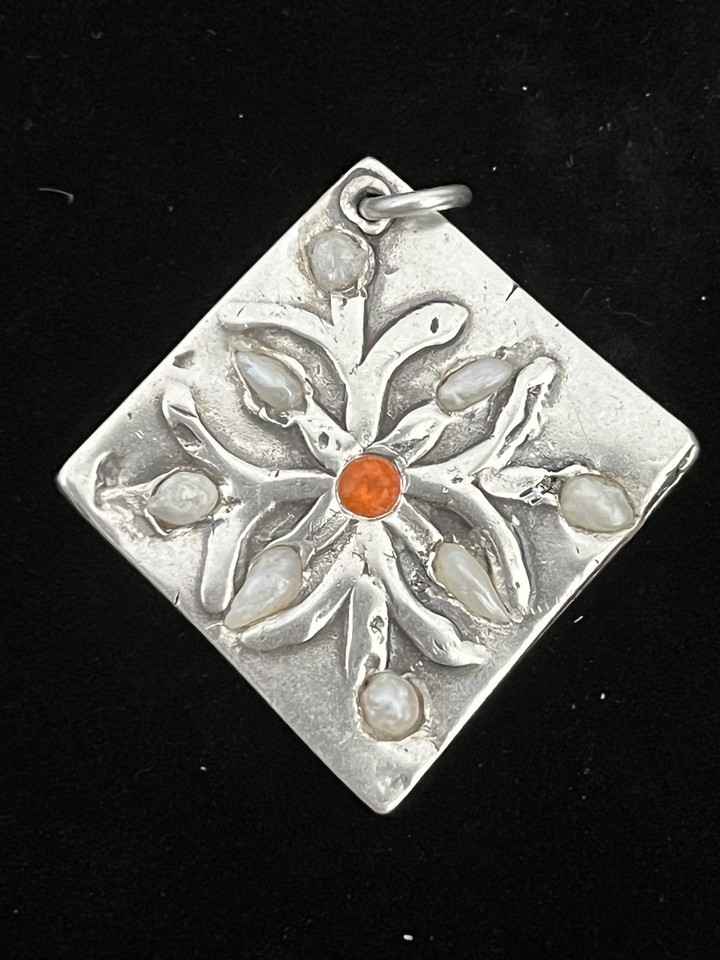 A GIFT BOX AND BAG WILL BE INCLUDED WITH EVERY ITEM PURCHASED DURING THE HOLIDAY SEASON.Nadine Ifrah Leo and her daughter Maya Ella Nelson own the Mississippi River Pearl Jewelry, Co, est. 1982. Nadine traveled the American Rivers acquiring natural pearls, especially the upper Mississippi River. Nadine has supplied many of the finest jewelers around the world including Tiffany Co, Harry Winston, Mikimoto, etc. She sold a 24mm Mississippi River Pearl to Queen Elizabeth's jeweler that was subsequently used in Princess Diana's Ring. Pendant has eight inlaid Mississippi river pearls, and one semi-precious gem in a floral design and measures 1.25 inch long and 1.25 inch wide. Signed NL. A very rare piece.Stop by our Shop and see all the Sale Items.
