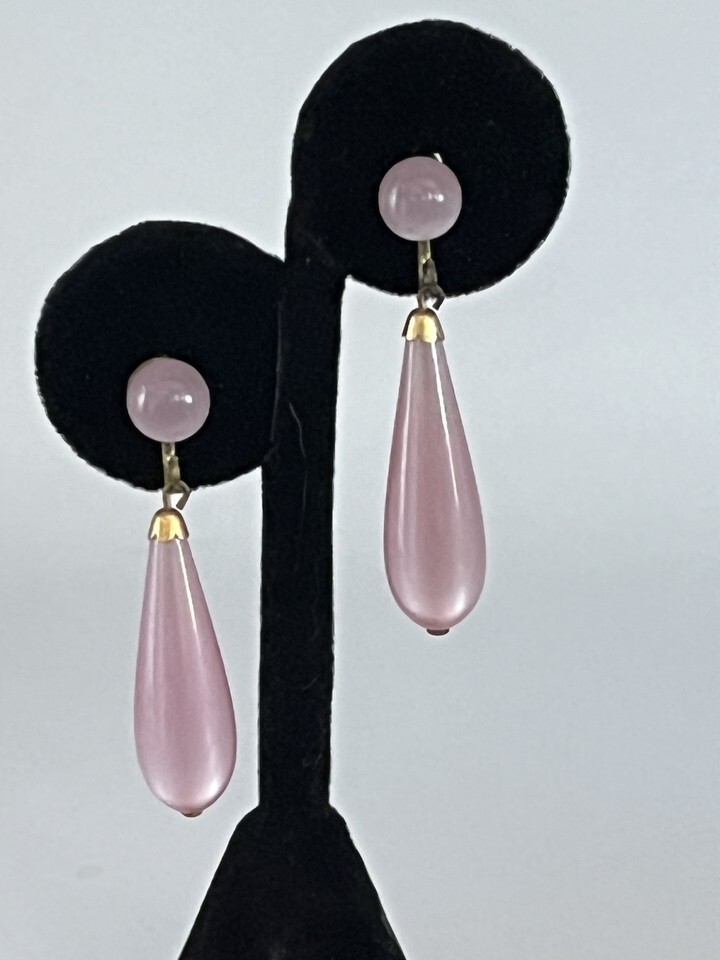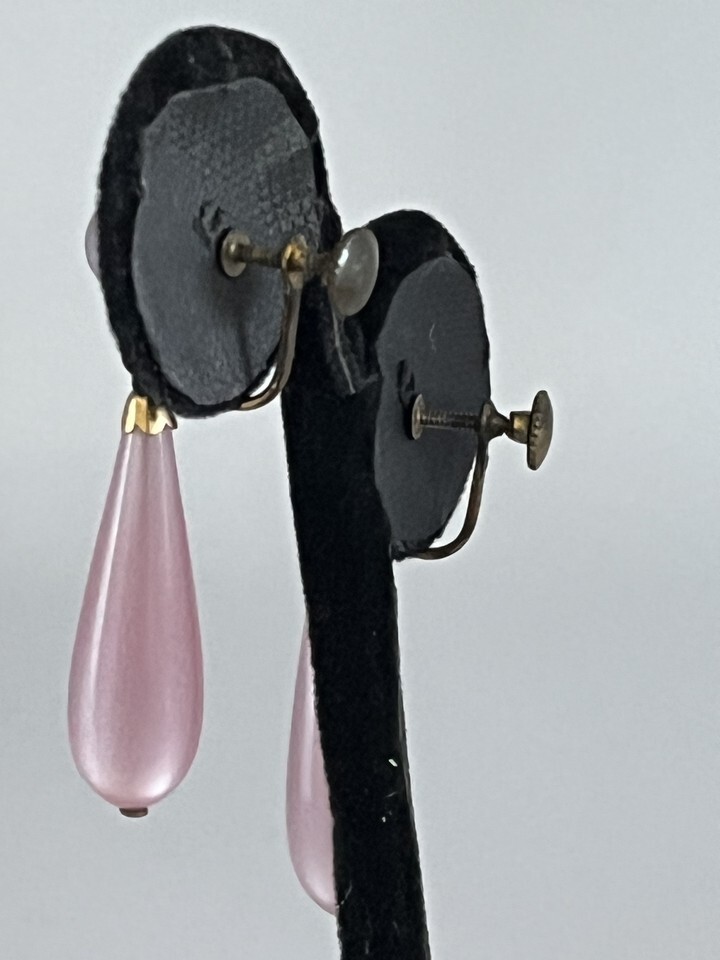 A GIFT BOX AND BAG WILL BE INCLUDED WITH EVERY ITEM PURCHASED DURING THE HOLIDAY SEASON.Gorgeous thermoset vintage earrings in pink with gold toned tops. Earrings are attached by screw plates. These are likely circa 1950's and look fabulous. Measure 1.75 inch in length.