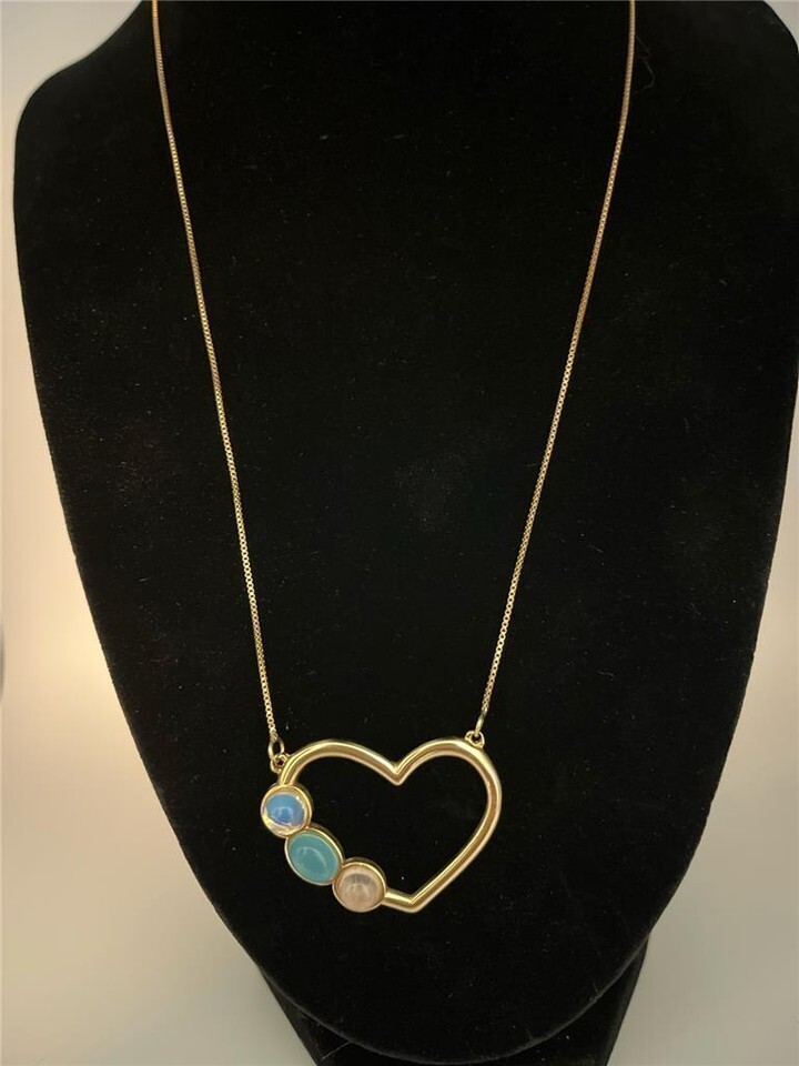 Gorgeous gold plated necklace with heart shaped pendant. Stones are Opaline, Blue Sky Agate and Rose Quartz. This is a beautiful piece made in Spain.