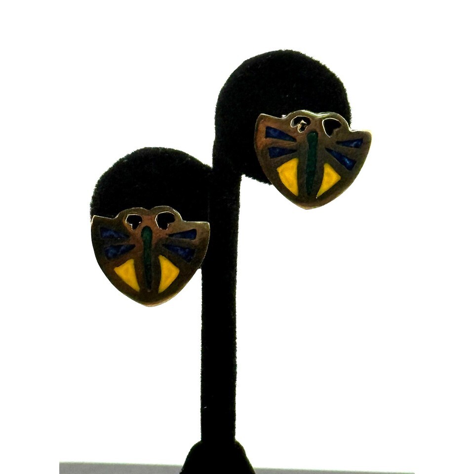 Rare Vintage Alpaca Mexico Inlaid Butterfly Clip on Earrings