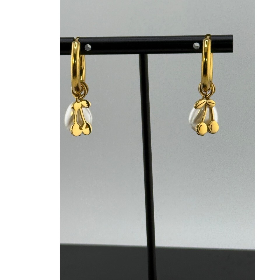 A GIFT BOX AND BAG WILL BE INCLUDED WITH EVERY ITEM PURCHASED DURING THE HOLIDAY SEASON.Classic lightweight gold hoops that can be worn in 4 ways. The hoops come with a cherry and pearl charm. 18k gold plated brass (10 times thicker than normal gold plating). Size is approx. 1.25 inches long by 0.5 inches wide.