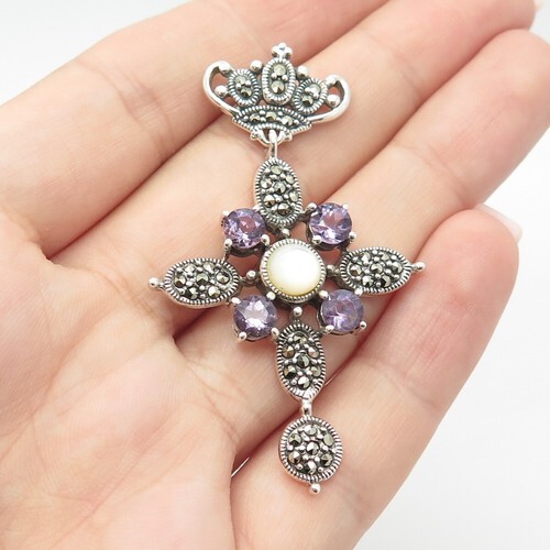 Vintage 925 Sterling Silver Signed Peter Stone Cross Pendant Necklace
