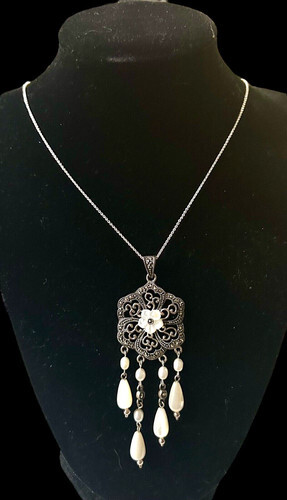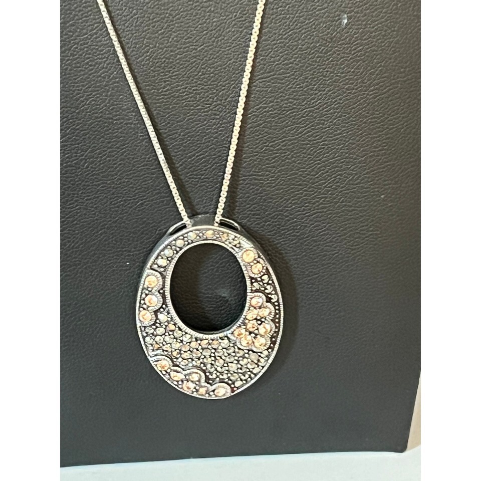 A GIFT BOX AND BAG WILL BE INCLUDED WITH EVERY ITEM PURCHASED DURING THE HOLIDAY SEASON.Sterling silver pink rhinestones and marcasite oval shape pendant and box chain necklace. Weight 10.3 grams. Pendant length 1 1/2 inches, hallmarked NF 925 Thailand. Chain length 18 inches, hallmarked 925 Italy. Condition very good.