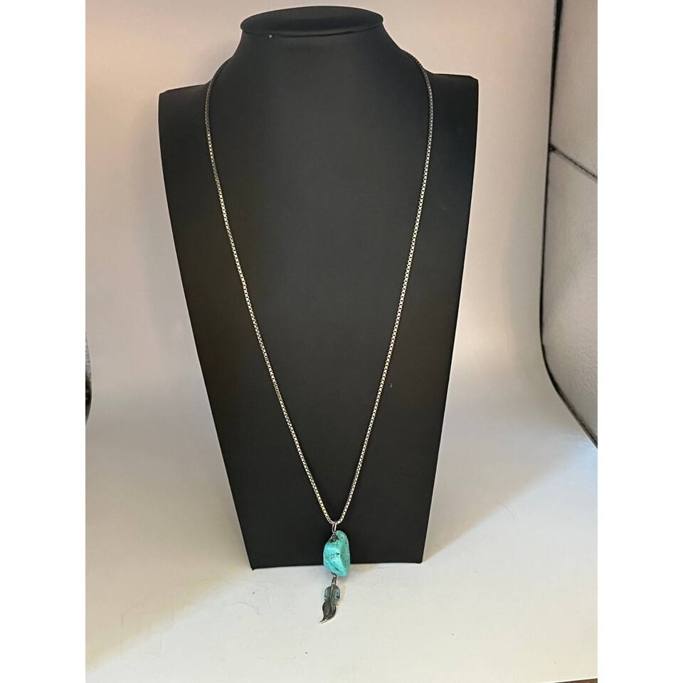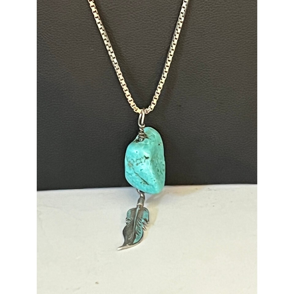 A GIFT BOX AND BAG WILL BE INCLUDED WITH EVERY ITEM PURCHASED DURING THE HOLIDAY SEASON.Sterling silver free shape turquoise nugget and feather pendant with box chain necklace. Weight 8.73 grams. Pendant length 2 1/4 inches with bail, no hallmark, tested 925 sterling silver. Chain length 20 inches, hallmarked 925 Italy. Condition very good.