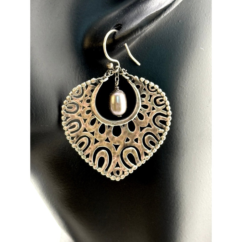 A GIFT BOX AND BAG WILL BE INCLUDED WITH EVERY ITEM PURCHASED DURING THE HOLIDAY SEASON.Vintage Sterling Filigree Tahitian Earrings, Pierced, 2", 1980's-1990's. These are a flat heart shaped earrings with a filigree design with open curved cut-outs filling the hoops. In the center at top is an open circle with a lavender Tahitian oblong pearl dangling. The earrings are marked .925 on the posts and Indonesia on the frame of the circle. They test as sterling with an appx. weight of 10gr that includes the pearl. They are appx. 2" tall from the curve in the hook post and 1.25" wide. Very good condition.