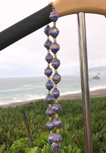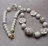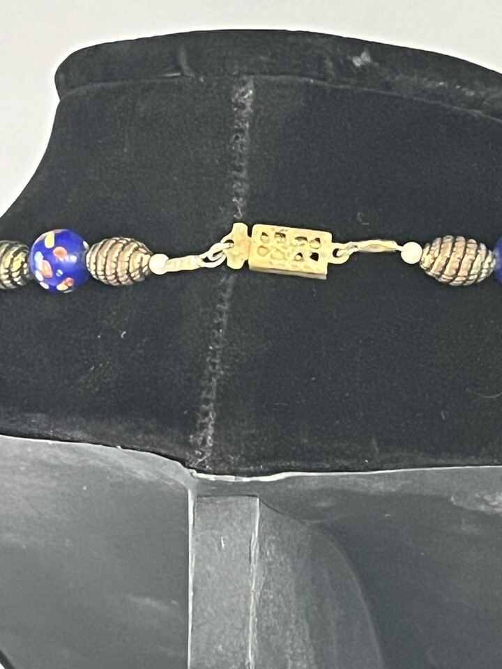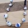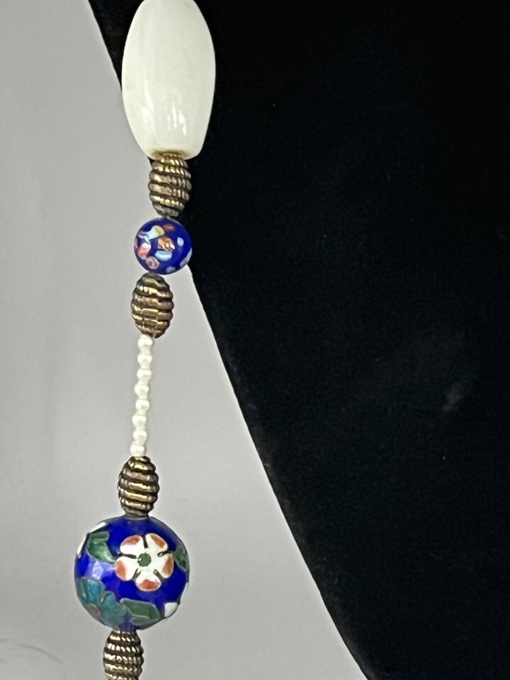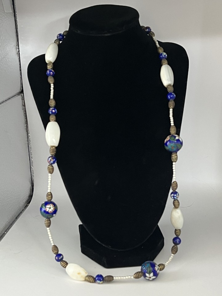 A GIFT BOX AND BAG WILL BE INCLUDED WITH EVERY ITEM PURCHASED DURING THE HOLIDAY SEASON.A Chinese necklace with 15 hand painted bue porcelain beads, and six white polsijed stones. Fresh water seed pearls and gold tone spacers. 26" long with tongue clasp. Very pretty.
