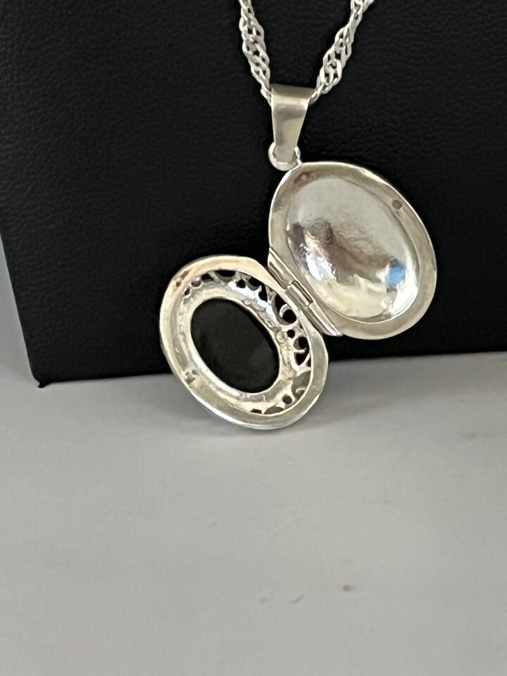 A GIFT BOX AND BAG WILL BE INCLUDED WITH EVERY ITEM PURCHASED DURING THE HOLIDAY SEASON.Beautiful Italian 925 sterling silver locket and chain, stamped Italy and has a silver maker's mark along with 925. The ribbon chain shimmers and compliments the locket and is 19 inches long. The locket is hinged and measures 3/4 inches. The onyx stone is inlaid in a gorgeous carved setting. This is a wonderful piece to add to your collection.Stop by our Shop and see all the Sale Items.
