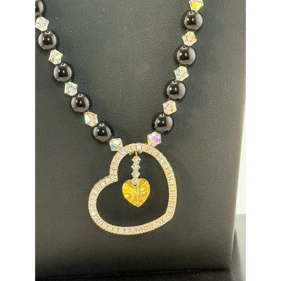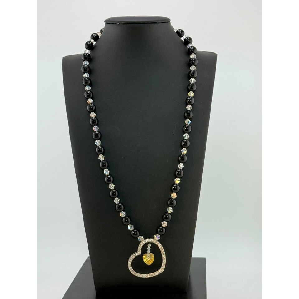 A GIFT BOX AND BAG WILL BE INCLUDED WITH EVERY ITEM PURCHASED DURING THE HOLIDAY SEASON.Beautiful necklace with heart pendant measuring approx. 1.3 inches and necklace measuring 18 inches. Lovely small agate globes interspersed with glass beads. Very versatile piece to add to your collection.