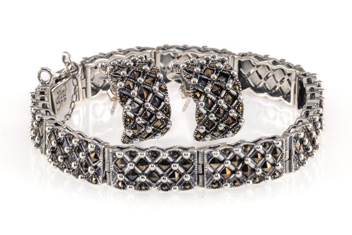 Gorgeous Sterling Silver Marcasite Bracelet and Earring Set Milgrain Detail
