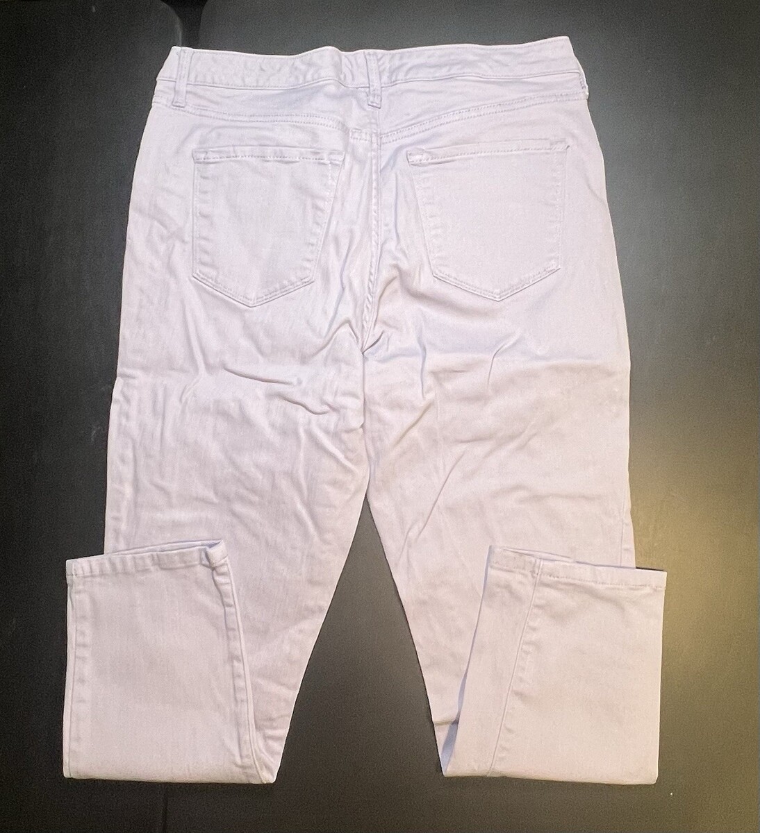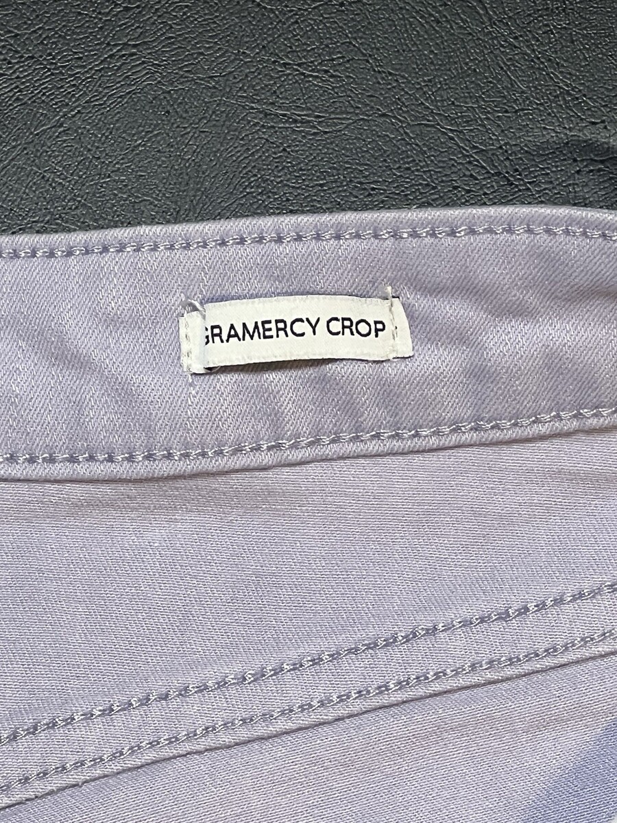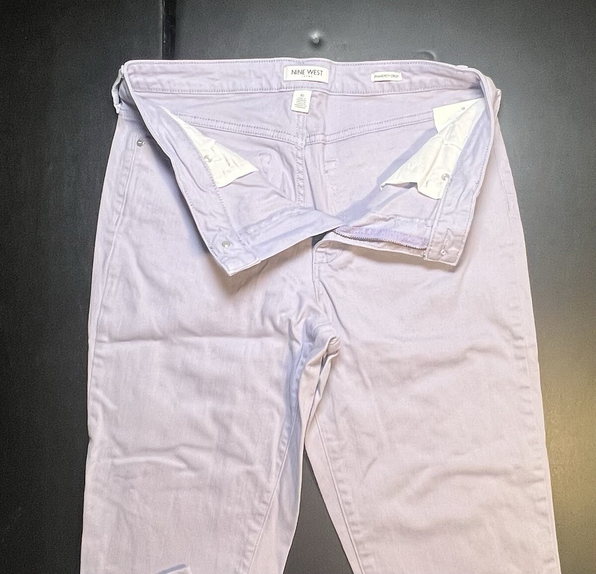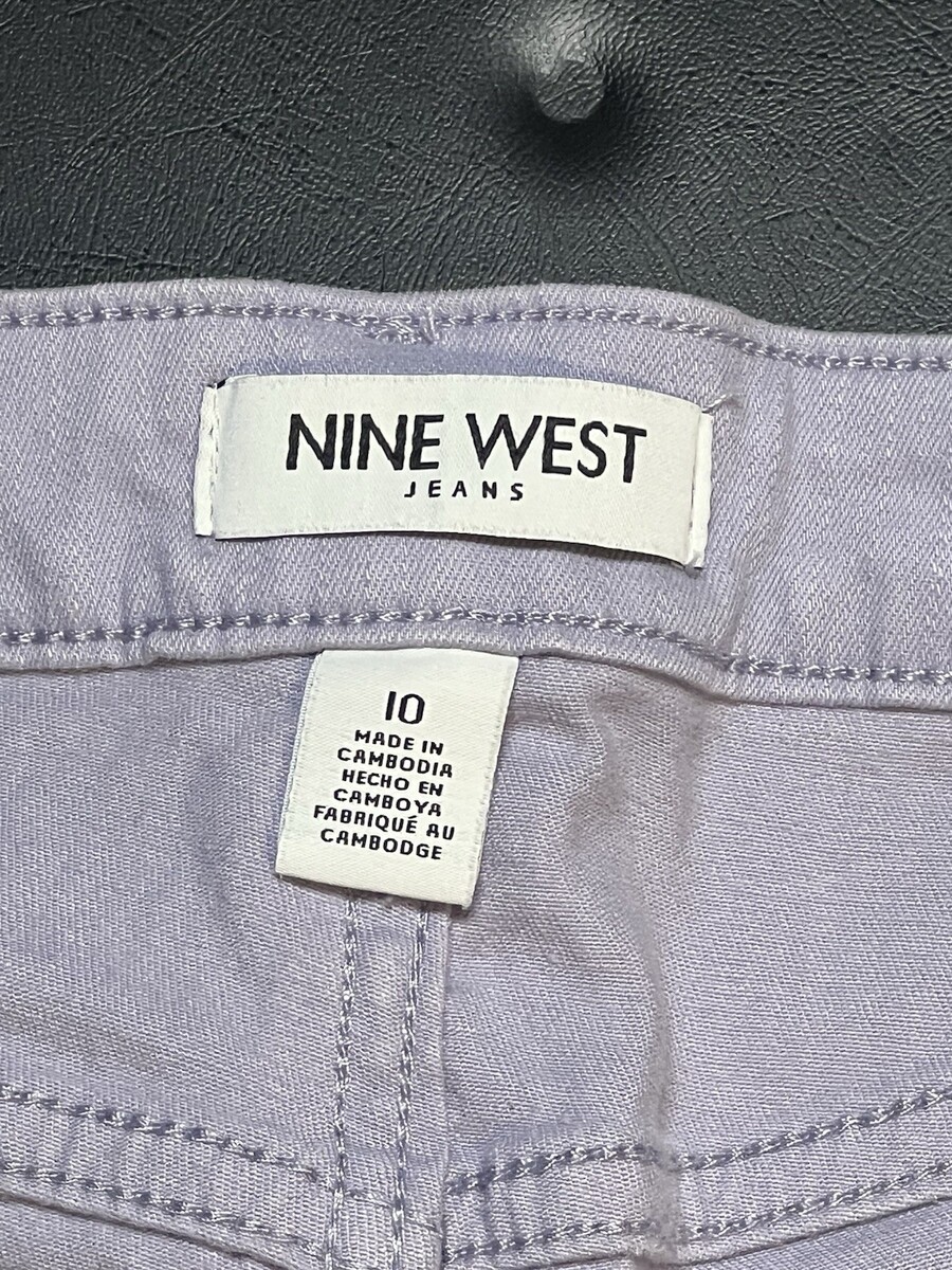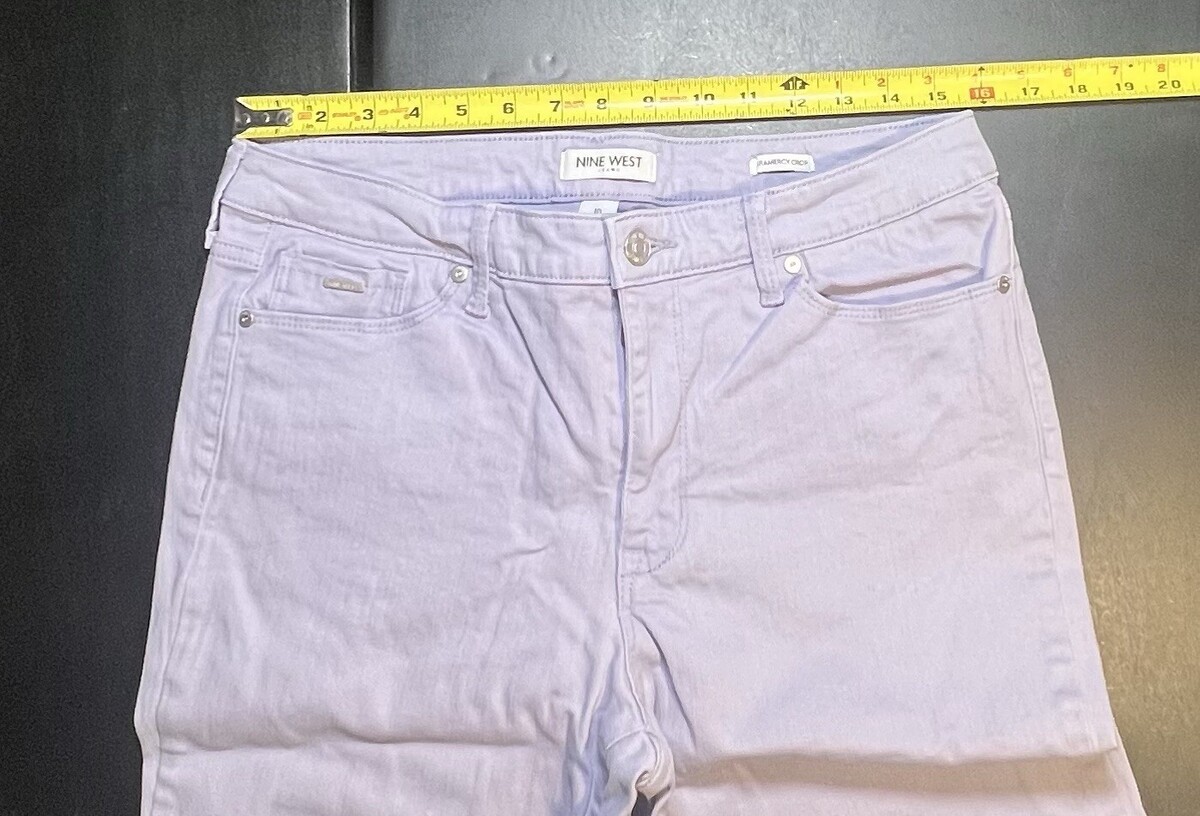 The product is a pair of Nine West jeans in a size 10, featuring a cropped style in a lilac color. This fashionable crop length is perfect for a trendy and casual look, while the regular fit ensures a comfortable and flattering silhouette. The vibrant purple color adds a pop of color to any outfit, making these jeans a stylish addition to any woman's wardrobe.