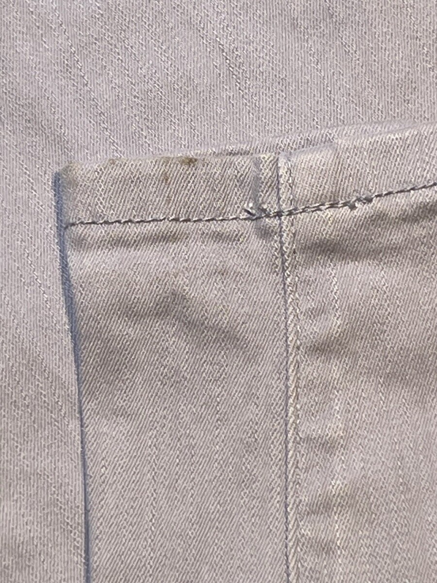 There is what appears to be a spot of dirt on the bottom front of the right leg. It may come out with a wash.