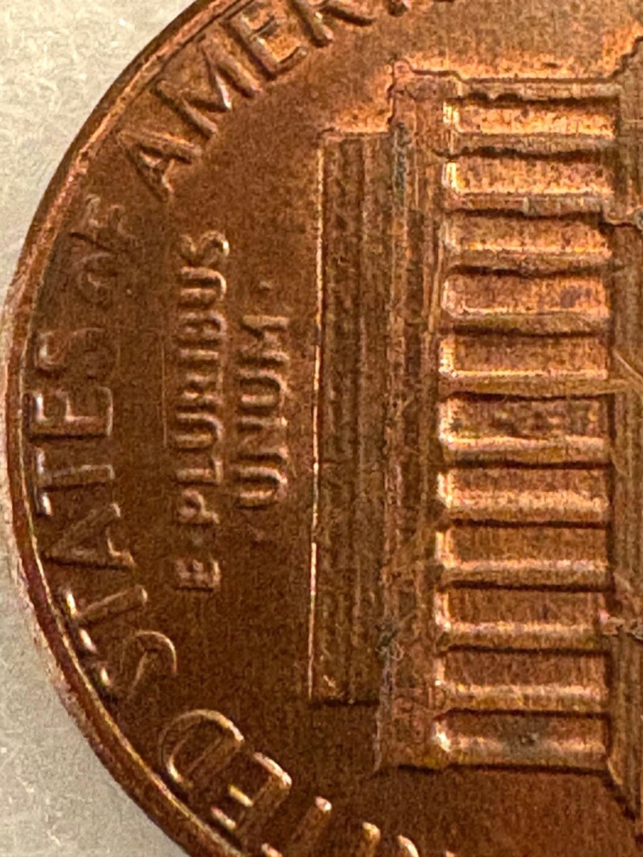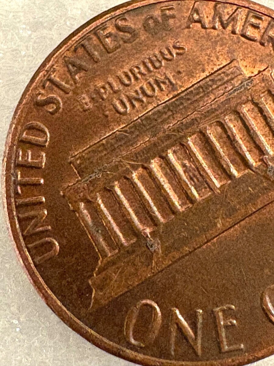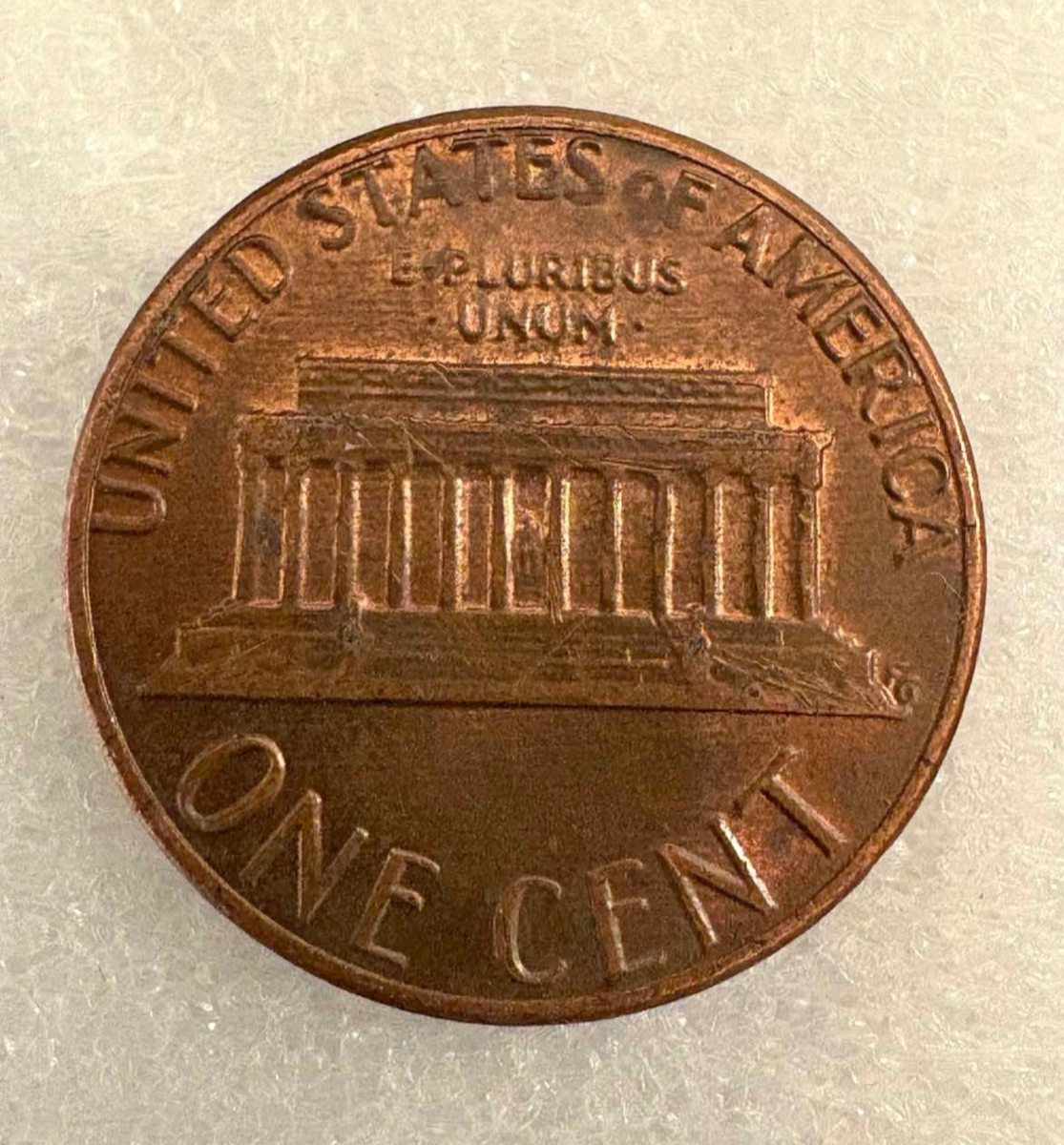 This small copper coin featuring the Lincoln Memorial on the obverse was minted in Philadelphia and bears a red color. Although not certified, this circulated coin is a valuable collector's item for those interested in US coinage with flaws and peculiarities.
